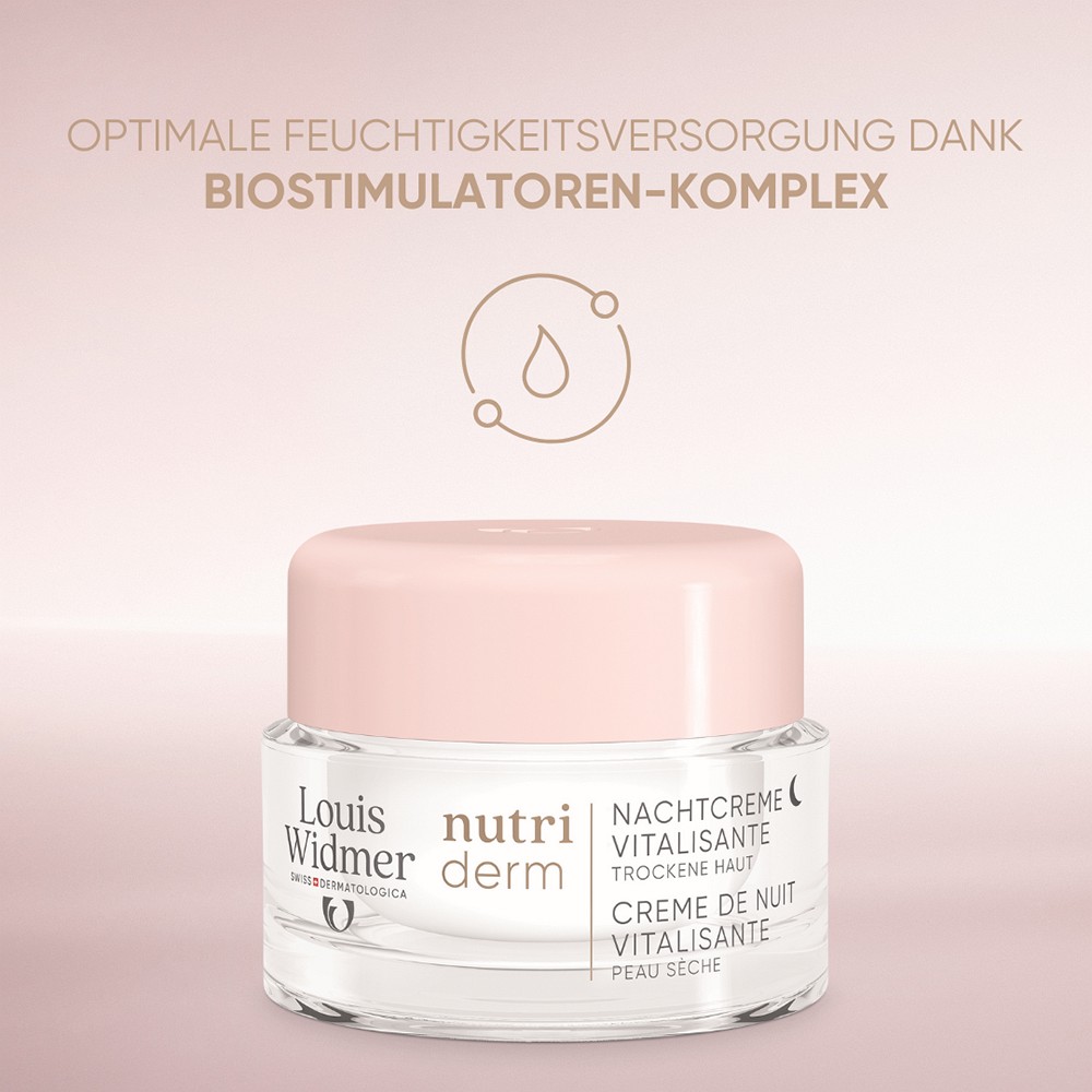 Bisheriger Produktname: Crème VitalisanteNährende, straffende Nachtcreme mit dem Louis Widmer Biostimulatoren-Komplex revitalisiert und mildert Fältchen bei trockener Haut.