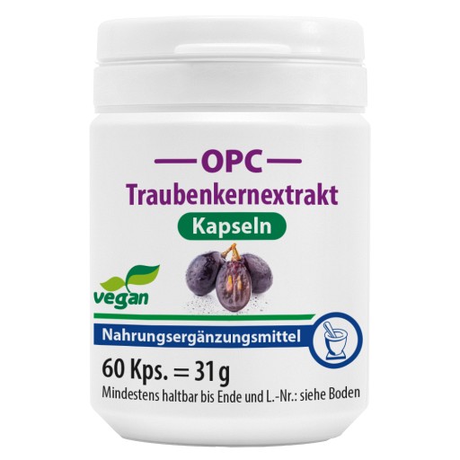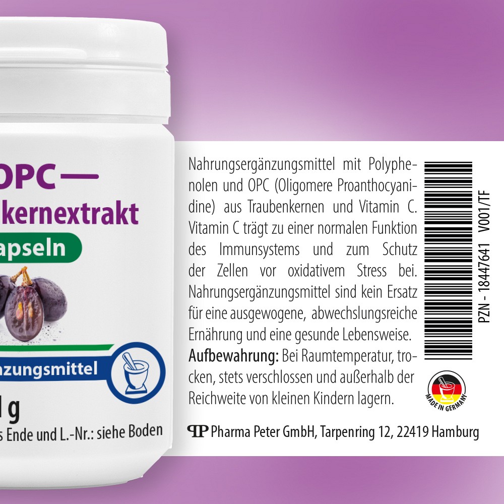 Nahrungsergänzungsmittel mit Polyphenolen und OPC (Oligomere Proanthocyanidine) aus Traubenkernen, sinnvoll kombiniert mit Vitamin C.Vitamin C trägt zu einer normalen Funktion des Immunsystems und zum Schutz der Zellen vor oxidativem Stress bei.