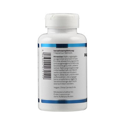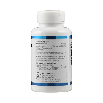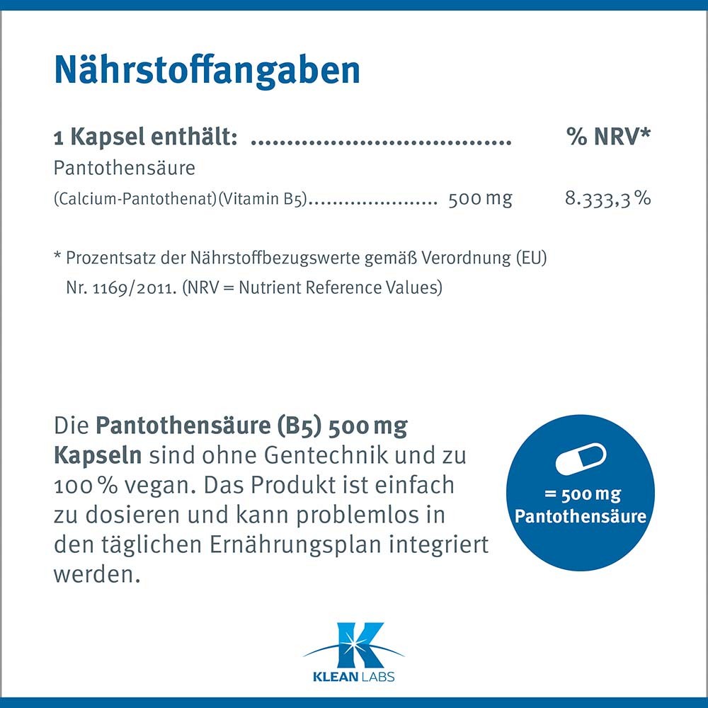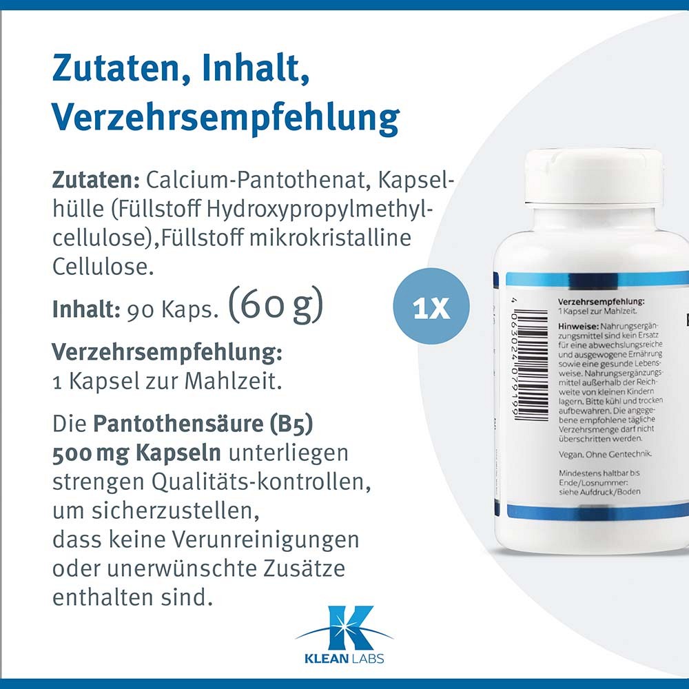 Pantothensäure (B5) 500 mg liefert 500 mg des Vitamins pro Kapsel. Die Pantothensäure ist als Calcium-Pantothenat gebunden, um eine besonders gute Aufnahme zu gewährleisten.