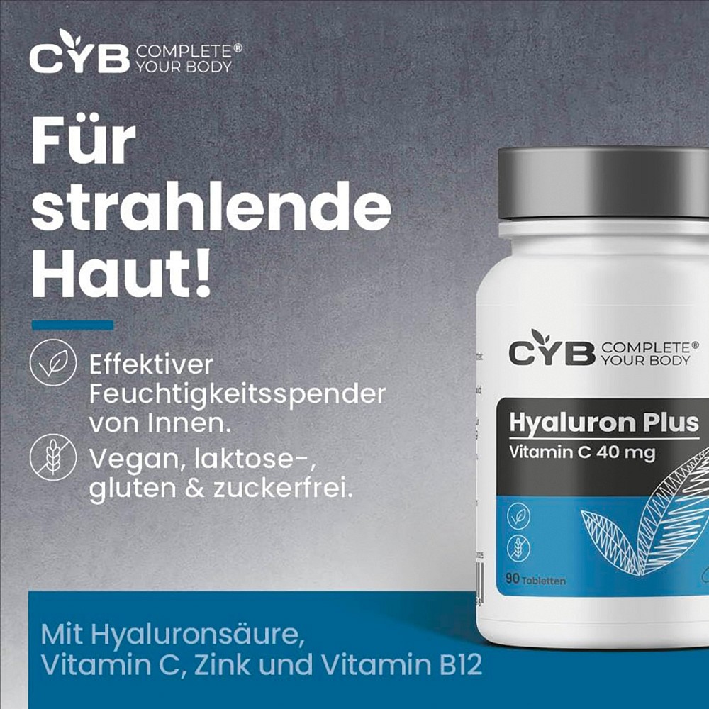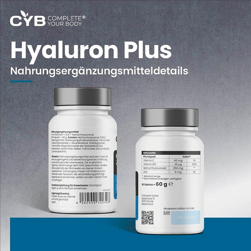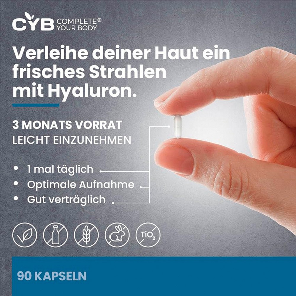 Hyaluronsäure steckt in der Haut vor allem im Gelenk- und Bindegewebe - sie sorgt für schöne, straffe Haut und ein jugendliches Aussehen. Um einem Mangel mit zunehmendem Alter entgegenzuwirken, enthalten CYB Hyaluron Plus Kapseln hochwertiges Hyaluron und tragen so zu einem frischen Hautbild bei.Zudem sorgen die Vitamine C und B12 sowie das Spurenelement Zink für schöne Haare, Nägel und starke Knochen.