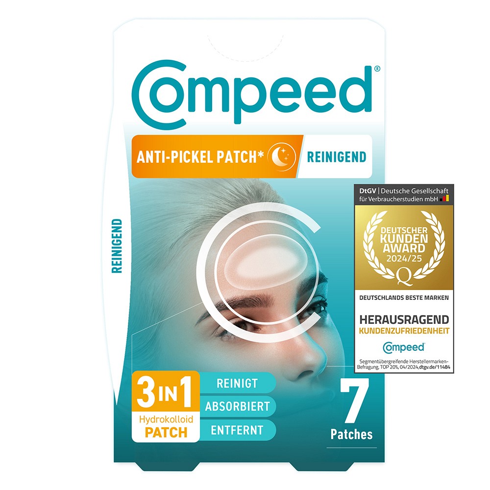 Die COMPEED® Anti-Pickel* Patches REINIGEND haben eine Dreifachwirkung: Sie reinigen, absorbieren und entfernen.*Pickel, Mitesser und Unreinheiten.