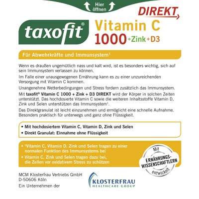 Wenn es draußen ungemütlich nass und kalt wird, ist es besonders wichtig, sich auf sein Immunsystem verlassen zu können. Im Falle einer unausgewogenen Ernährung kann es zu einer unzureichenden Versorgung mit Vitmanin C kommen. Unangenehme Wetterbedingungen und Stress fordern zusätzlich das Immunsystem.Mit taxofit® Vitamin C 1000 + Zink + D3 Direkt wird der Körper in solchen Zeiten unterstützt. Das hochdosierte Vitamin C sowie die weiteren Inhaltsstoffe Vitamin D, Zink und Selen unterstützen das Immunsystem. Das Direktgranulat ist leicht einzunehmen und ermöglicht eine schnelle Aufnahme. Besonders praktisch für unterwegs und ganz ohne Flüssigkeit.