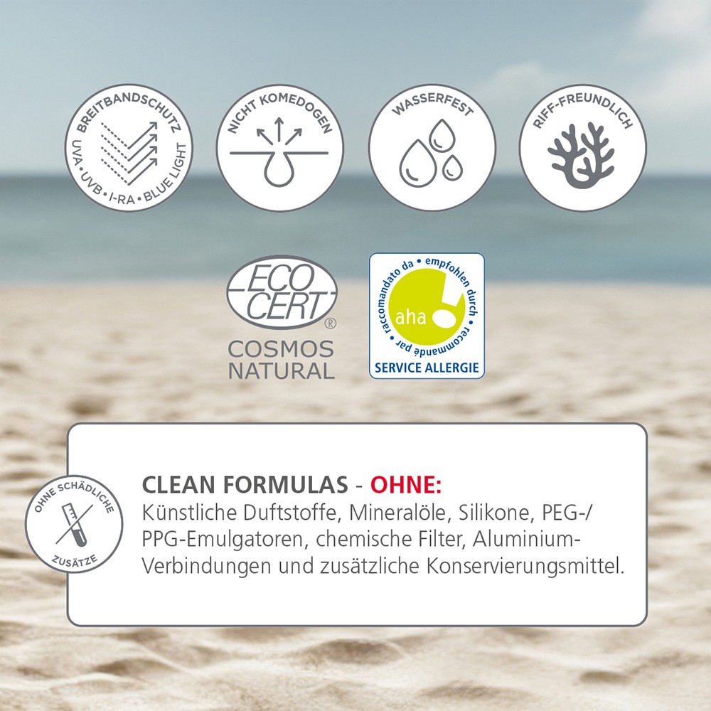 Sonnenschutz immer 15 bis 30 Minuten vor der Sonnenexposition grosszügig auftragen. Zu gering aufgetragene Mengen reduzieren die Schutzleistung markant.Auch Sonnenschutzprodukte mit hohem Lichtschutzfaktor bieten keinen vollständigen Schutz.