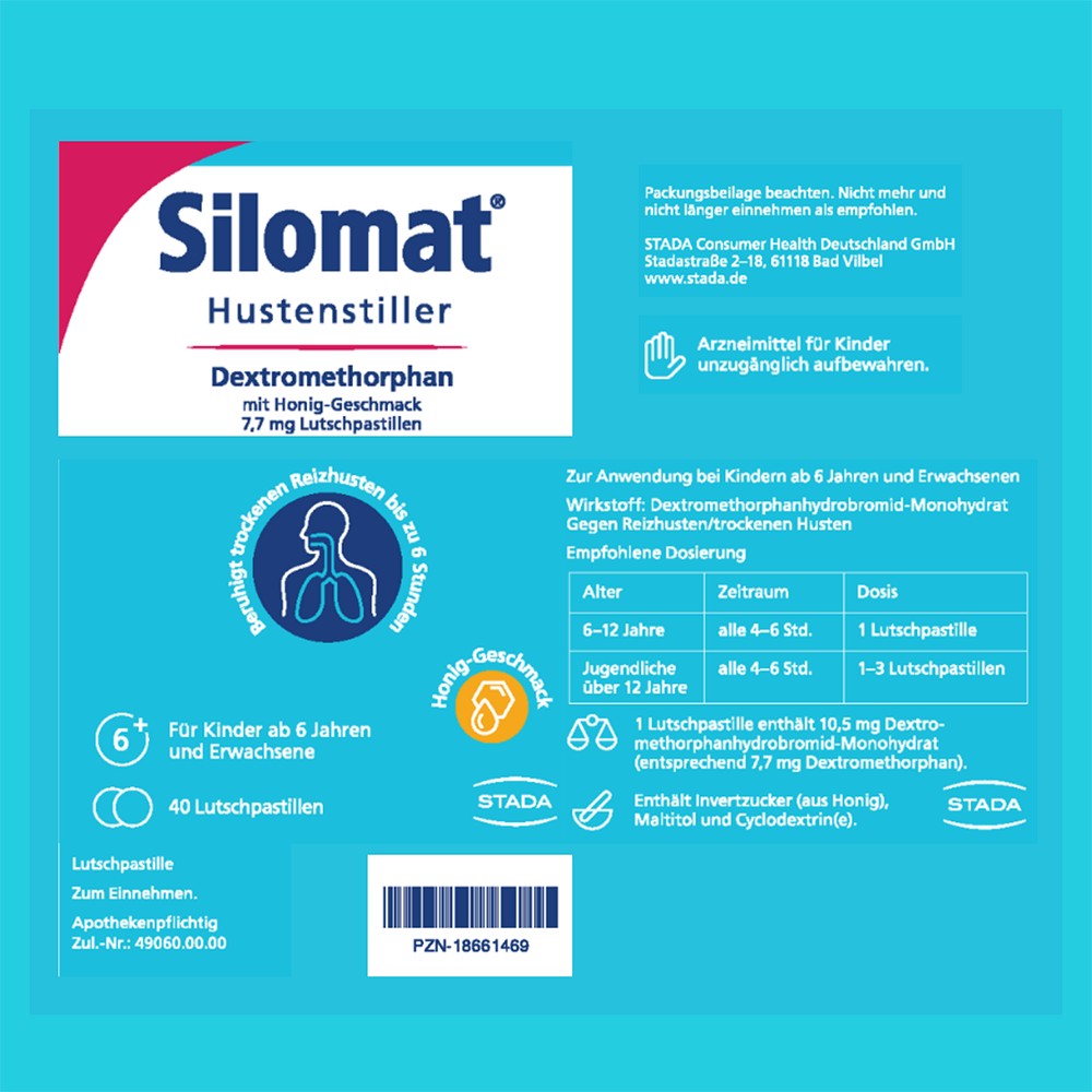 Dextromethorphan, der am besten untersuchte hustenstillende Wirkstoff der Welt in den Silomat Lutschpastillen mit echtem Honig, dämpft die Wahrnehmung des Hustenreizes. So können sich die Schleimhäute in den Bronchien erholen und auch Sie können wieder zur Ruhe kommen. Das Lutschen schafft bereits erste Linderung während sich die Wirkung sukzessive aufbaut.ANWENDUNGSEMPFEHLUNG