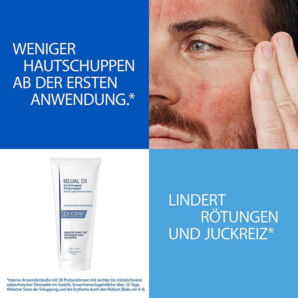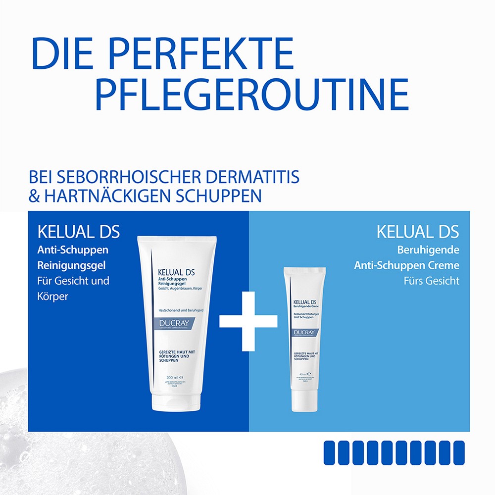 Das KELUAL DS Anti-Schuppen Reinigungsgel reinigt gereizte Haut mit Rötungen und entfernt dank der patentierten Aktivstoff-Kombination aus Ciclopirox Olamin + Pirocton Olamin effektiv Schuppen im Gesicht und am Körper.