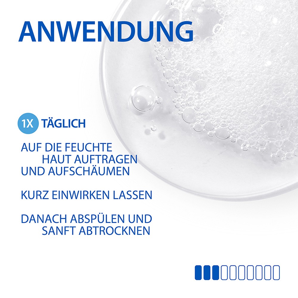 1-mal täglich auf die feuchte Haut auftragen und aufschäumen. Kurz einwirken lassen. Danach mit Wasser abspülen und sanft abtrocknen.Bei Augenkontakt die Augen sofort gründlich ausspülen.