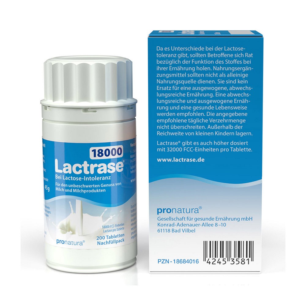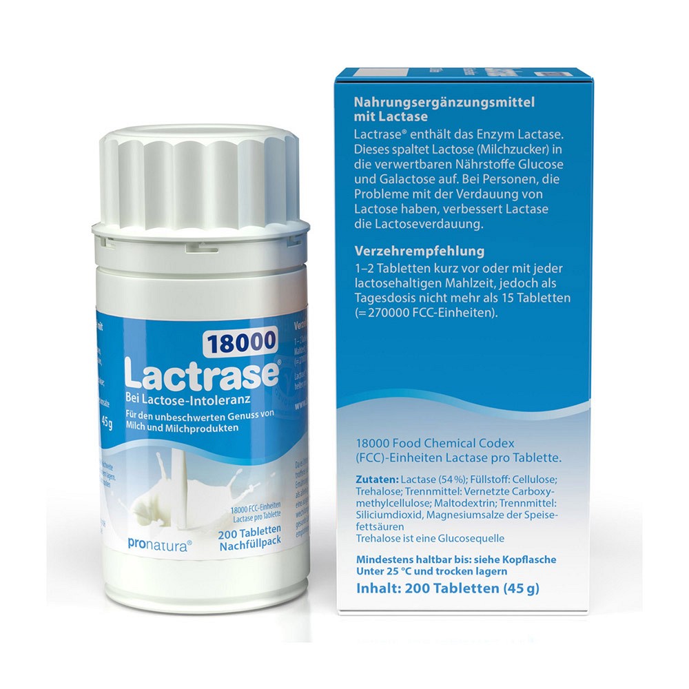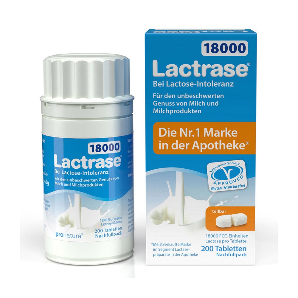 Lactrase 18000 unterstützt mit seiner millionenfach bewährten Sofortwirkung die Verdauung von Lactose (Milchzucker) und ermöglicht somit den Genuss von Milchprodukten. Das in den Tabletten enthaltene Enzym Lactase ersetzt die bei Lactoseunverträglichkeit fehlende körpereigene Lactase und spaltet die Lactose in ihre leicht verwertbaren Bestandteile Glucose und Galactose auf. So wird der Genuss von Eisbechern, Cremesuppen und Joghurts wieder möglich.