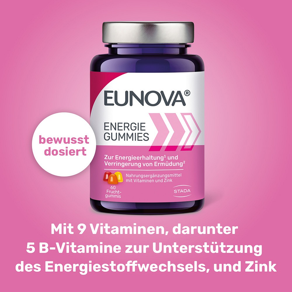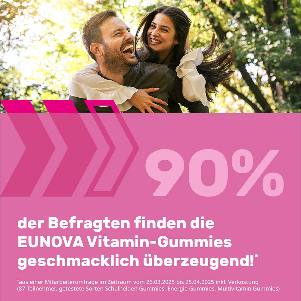Laut der nationalen Verzehrstudie3 sind einige Erwachsene nicht optimal mit allen Nährstoffen versorgt. Bereits ein Gummi täglich unterstützt den Energiestoffwechsel und unterstützt Sie dabei, im Job und im Alltag leistungsfähiger zu sein. Dabei legen besonders Menschen mit einem aktiven Lebensstil besonderen Wert darauf, umfassend versorgt zu sein.Mit EUNOVA Energie Gummies können Sie Ihre Extra-Portion Vitamine ganz einfach und lecker naschen. Die sorgfältig dosierten Inhaltsstoffe sind auf die Bedürfnisse von Erwachsenen und Jugendlichen abgestimmt und ergänzen eine gesunde Ernährung. So genießen Sie jeden Tag energiereich.