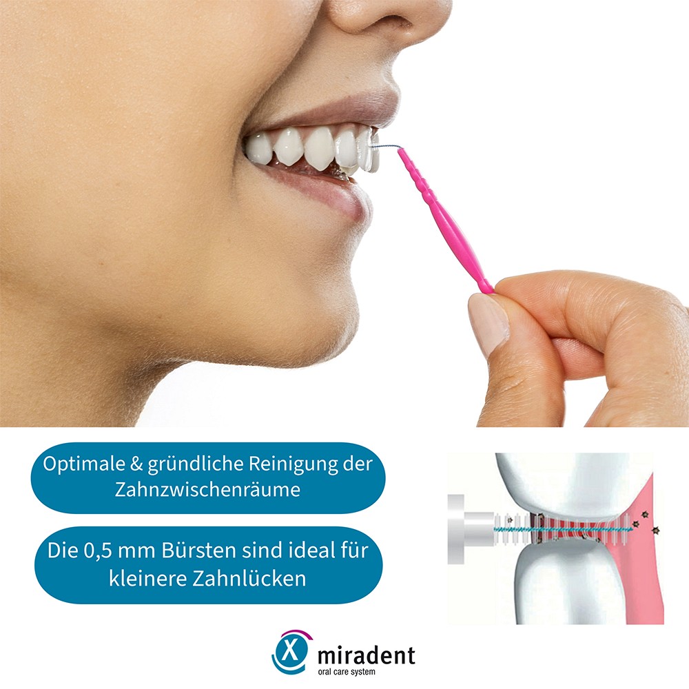 Die miradent Pic-Brush Minis sind hochwertige Interdentalbürsten der ISO-Größe 2 (PHD 0,9–1,0 mm / 0,5 mm), speziell entwickelt für die gründliche Reinigung enger Zahnzwischenräume – auch bei Brackets, Brücken und Zahnersatz.