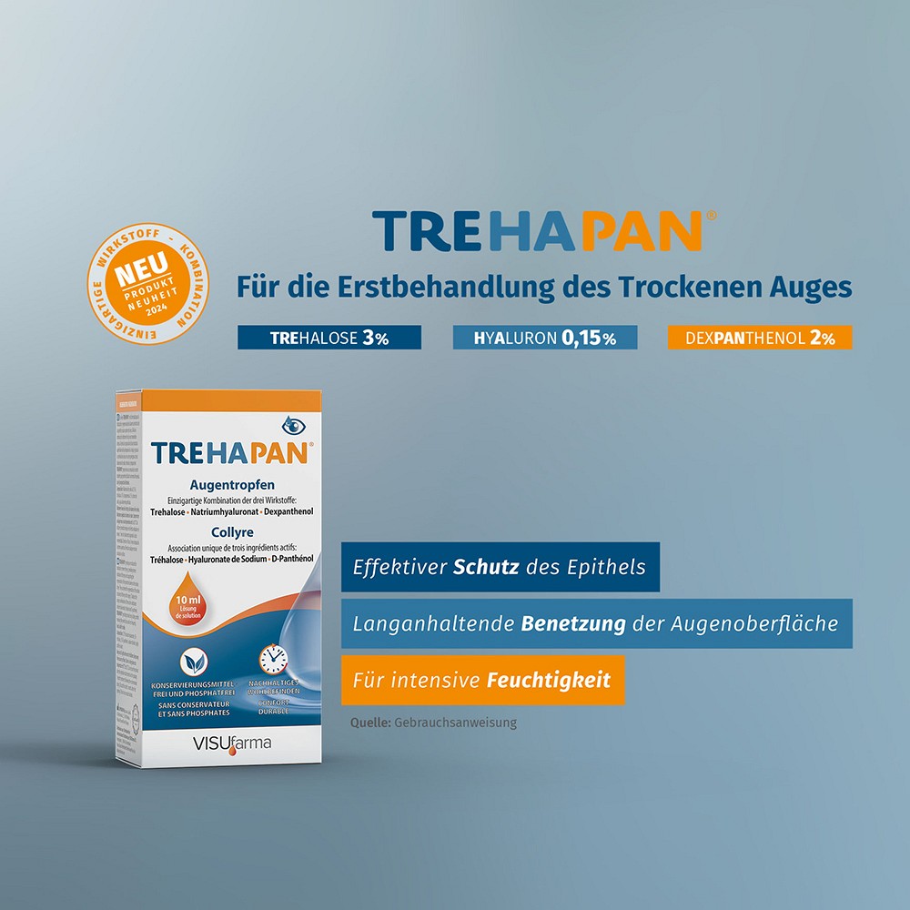 Eine ausgewogene Kombination aus 3 Inhaltsstoffen für die Behandlung trockener AugenDurch die einzigartige Zusammensetzung der Wirkstoffe Trehalose, Natriumhyaluronat und Dexpanthenol sorgen TREHAPAN Augentropfen für eine intensive Befeuchtung und fördern die Wiederherstellung der Schutzschicht auf der Augenoberfläche.