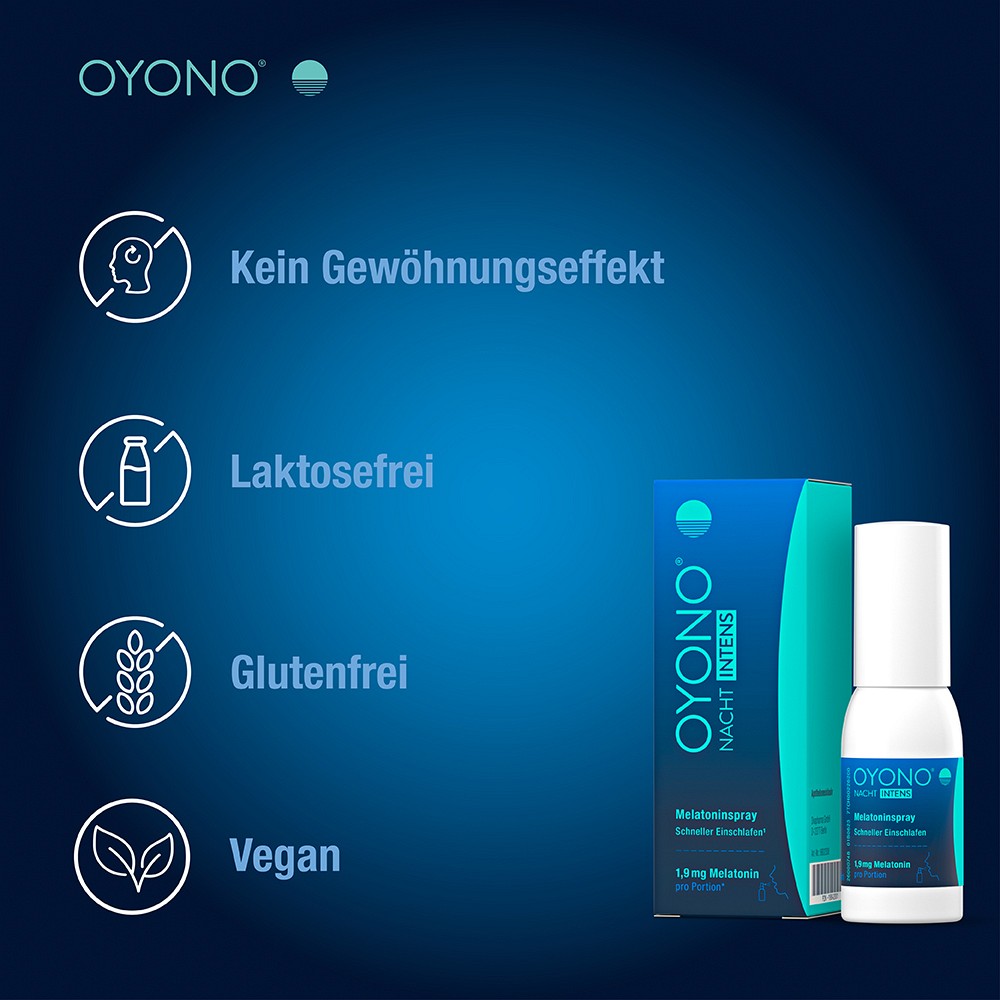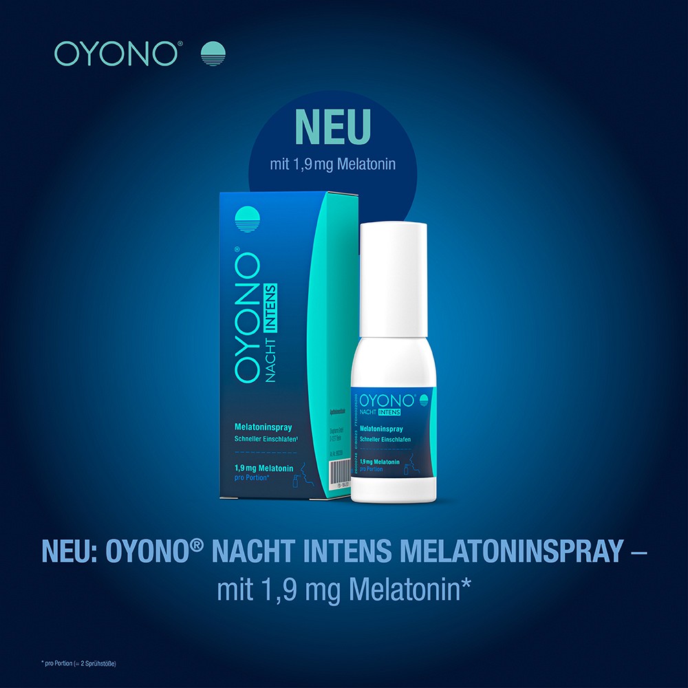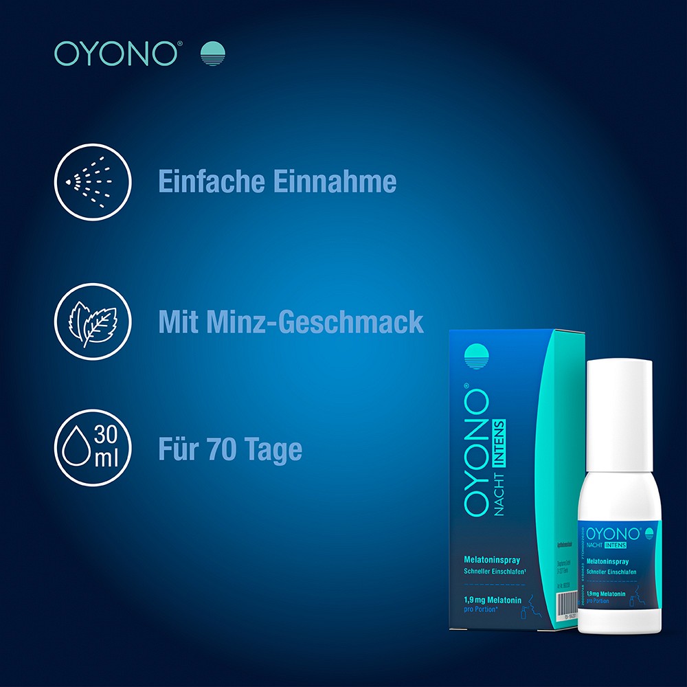 - Das Nahrungsergänzungsmittel OYONO® NACHT INTENS Melatoninspray ist in der Packungsgröße 30 ml erhältlich und reicht für 70 Tage