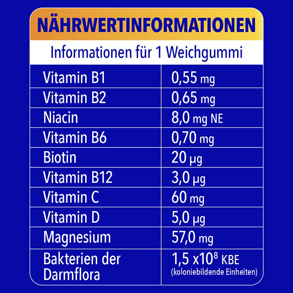Die neuen Bion3® Energy1 Weichgummis haben eine einzigartige Rezeptur mit einer Kombination aus Mineralstoffen und Vitaminen, die den Darm unterstützen und dafür sorgen, dass dein Energielevel den ganzen Tag hoch bleibt1,2 und mit Bakterienkulturen.Jedes leckere Weichgummi mit Orangengeschmack enthält 8 wichtige Vitamine, darunter B1, B2, Niacin, B6, Biotin und B12 zur Unterstützung des Energiestoffwechsels sowie Vitamin C und Magnesium zur Verringerung von Müdigkeit und Ermüdung.