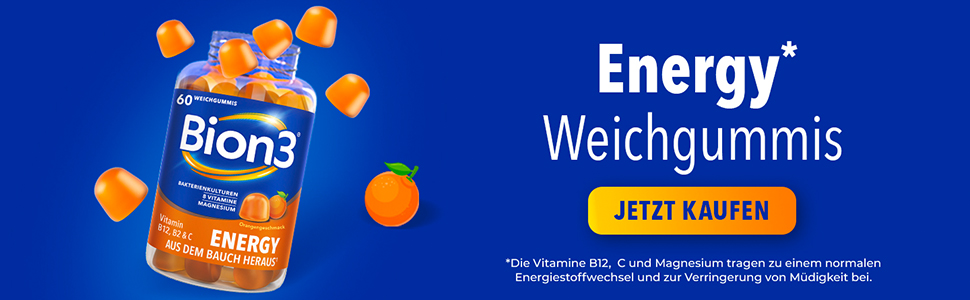 Die neuen Bion3 Energy1 Weichgummis haben eine einzigartige Rezeptur mit einer Kombination aus Mineralstoffen und Vitaminen, die den Darm unterstützen und dafür sorgen, dass dein Energielevel den ganzen Tag hoch bleibt1,2 und mit Bakterienkulturen.Jedes leckere Weichgummi mit Orangengeschmack enthält 8 wichtige Vitamine, darunter B1, B2, Niacin, B6, Biotin und B12 zur Unterstützung des Energiestoffwechsels sowie Vitamin C und Magnesium zur Verringerung von Müdigkeit und Ermüdung.