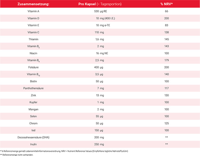 Enthält Folat (L-Methylfolat), DHA, Jod, Zink, Vitamin A