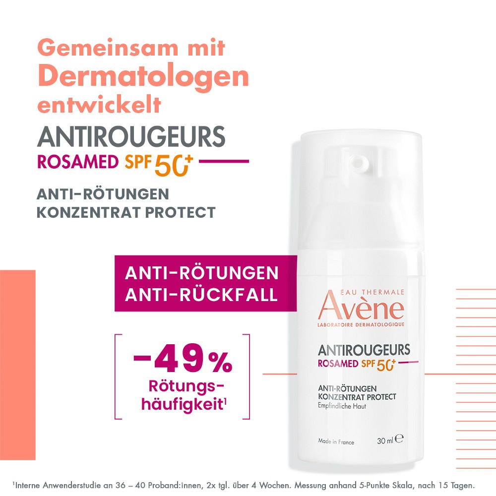 Das ANTIROUGEURS ROSAMED SPF50+ Anti-Rötungen Konzentrat Protect von Eau Thermale Avène ist eine Spezialpflege für empfindliche Haut, die zu Rötungen und Rosazea neigt. Durch die beruhigende Wirkung des Angiopausine wird das Hautbild deutlich verbessert, und die Haut findet zu ihrem natürlichen Gleichgewicht zurück.