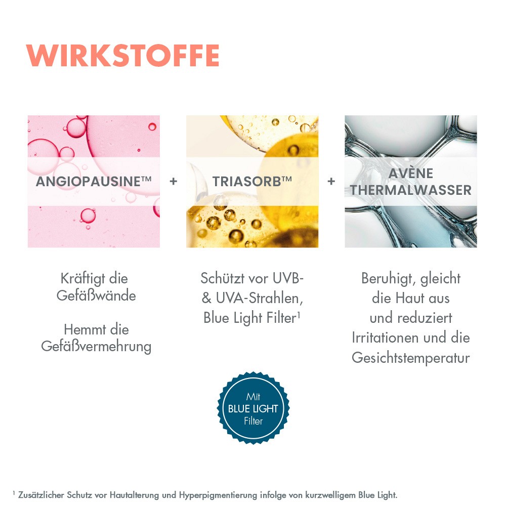 Die Kombination aus dem patentierten Wirkstoff Angiopausine und dem bekannten Avène Thermalwasser sorgt für eine effektive Reduktion der Rötungen. Das Thermalwasser wirkt beruhigend und reizlindernd. Angiopausine wirkt an der Ursache der Rötung, indem es die oberflächliche Hypervaskularisierung neutralisiert und die Gefäßstabilität wiederherstellt. So sorgt es für ein gleichmäßiges Hautbild.