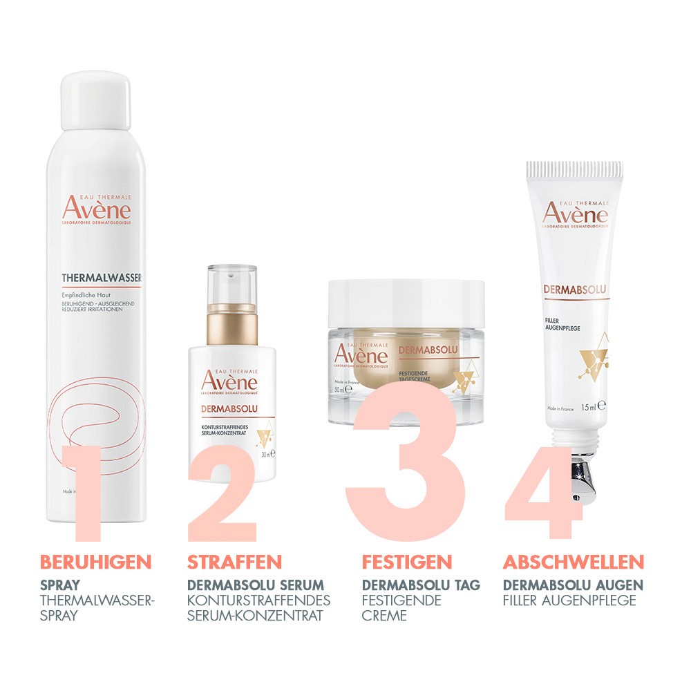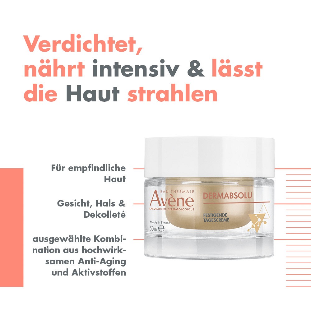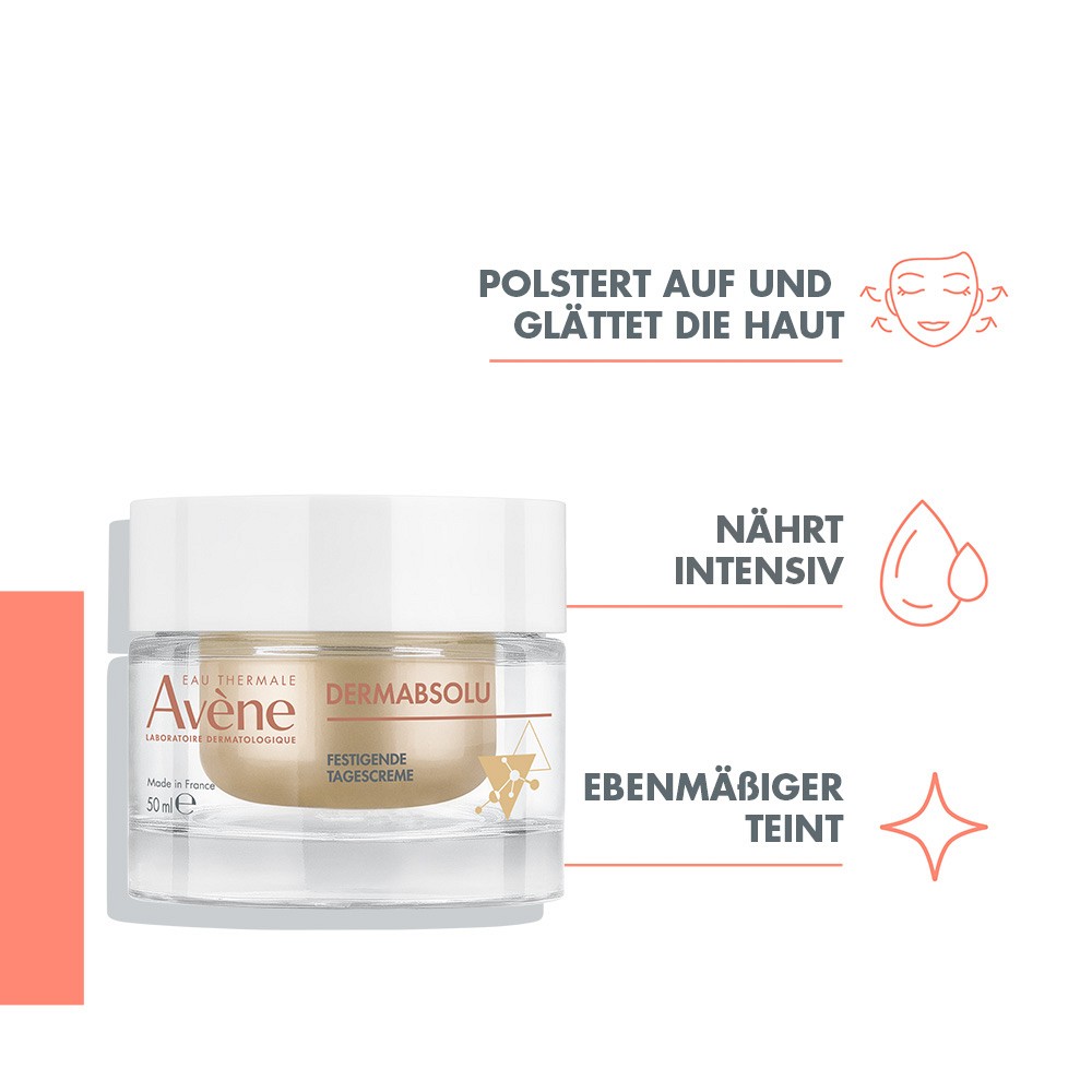 DERMABSOLU festigende Tagescreme von Eau Thermale Avène ist eine Anti-Aging Tagescreme für mehr Hautelastizität.Dermabsolu wirkt 3 klinischen Zeichen der Hautalterung entgegen: Die Gesichtskonturen werden gestrafft, die Haut wird intensiv genährt, und der Teint ist strahlend.