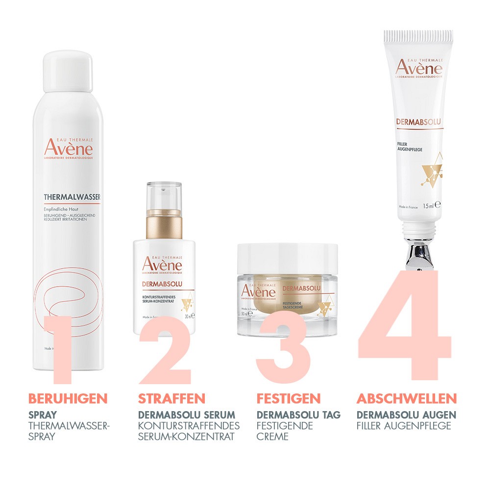 Die Eau Thermale Avène DERMABSOLU Filler Augenpflege füllt Falten auf, korrigiert Augenringe und mindert Schwellungen. Zudem hat es einen abschwellenden und kühlenden Effekt.