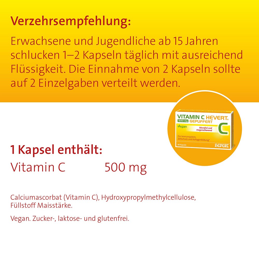Vitamin C Hevert 500 mg gepuffert – Nahrungsergänzungsmittel. Nicht empfohlen für Kinder und Jugendliche unter 15 Jahren. Der Verzehr während der Schwangerschaft und Stillzeit sollte in Absprache mit einem Arzt erfolgen. Zutaten: Calciumascorbat (Vitamin C), Hydroxypropylmethylcellulose, Füllstoff Maisstärke. Packungsgröße: 60 Kapseln.