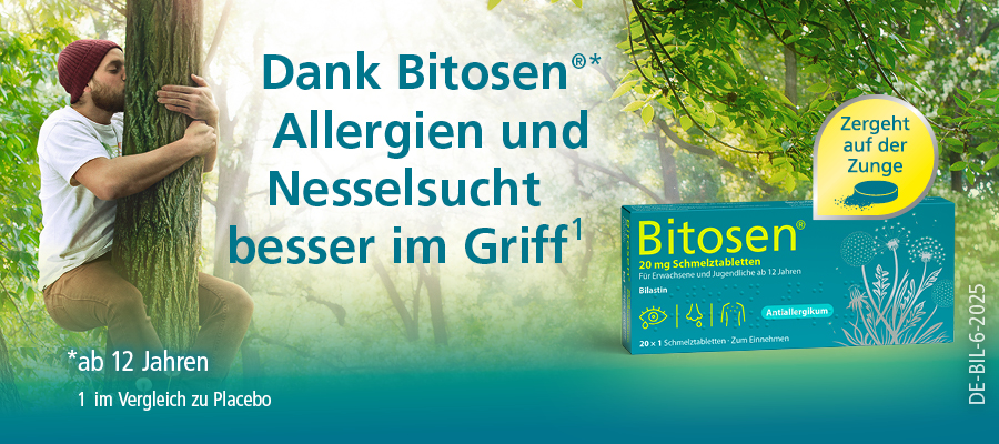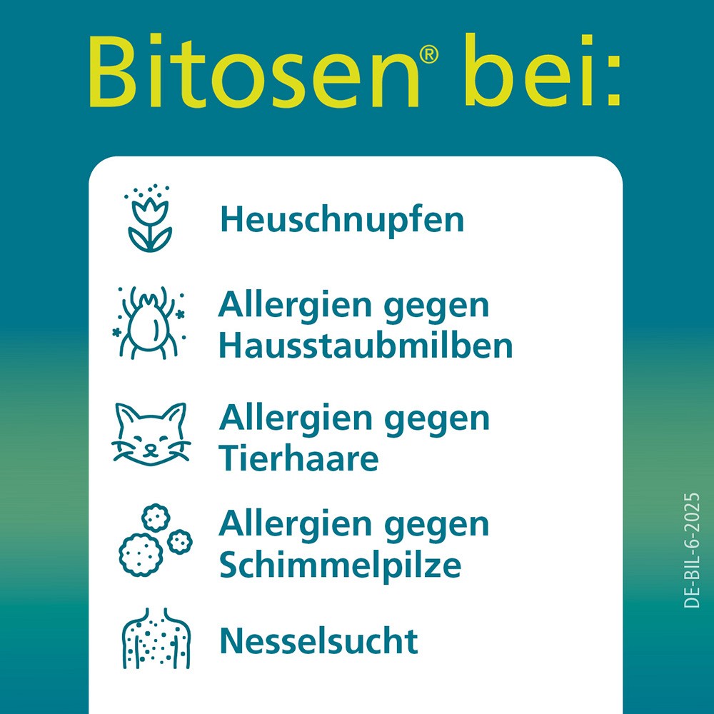 Bitosen* wird zur Behandlung allergischer Beschwerden, wie Heuschnupfen oder juckender Hautausschläge der Nesselsucht (Urtikaria) bei Erwachsenen und Jugendlichen ab 12 Jahren eingesetzt. Das Medikament ist für Kinder unter 12 Jahren nicht zugelassen.* Für Erwachsene und Jugendliche ab 12 Jahren.