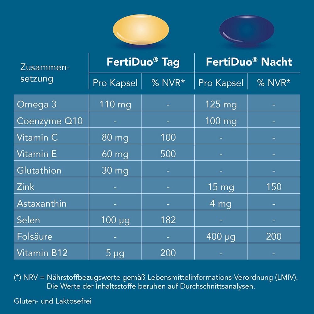 Es wird empfohlen, morgens 1 Kapsel FertiDuo Tag und abends 1 Kapsel FertiDuo Nacht einzunehmen.Als Monatspackung erhältlich (60 Weichkapseln).