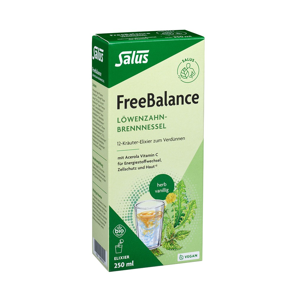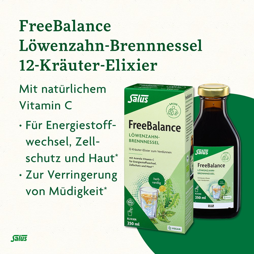 FreeBalance Löwenzahn-Brennnessel 12-Kräuter-Elixier ist in 100 % Bio-Qualität erhältlich, laborge-prüft und das Resultat der mehr als 100-jährigen Heilkräuter-Kompetenz des Unternehmens Salus. Zudem ist es vegan, frei von Konservierungsstoffen sowie alkoholfrei, laktosefrei und glutenfrei. Free-Balance wird in Deutschland hergestellt.