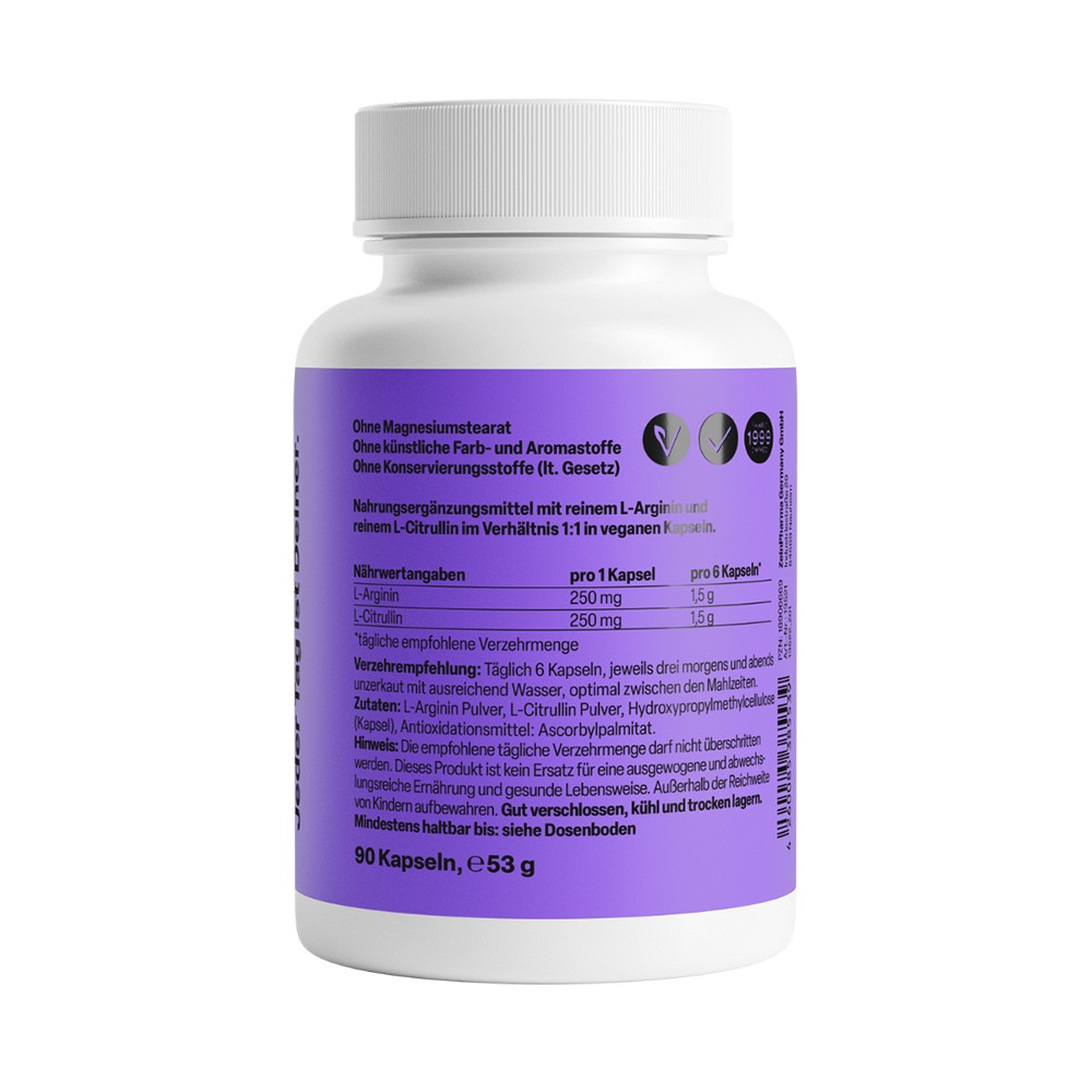 Unsere Packung mit 180 Pulver bietet eine Ration für 2 Monate beziehungsweise 60 Tage. In unserem L-Arginin + L-Citrullin Pulver verwenden wir nur hochwertige und reine Zutaten. Unsere Formel verzichtet auf unerwünschte Zusatzstoffe wie Magnesiumstearat und ist zu 100 % vegan.Außerdem ist sie frei von Zucker, Gluten, Laktose und Soja. Um höchste Qualität sicherzustellen, unterziehen wir unser Produkt regelmäßigen Prüfungen durch unabhängige deutsche Labore. Die Entwicklung und Produktion erfolgen in unserer eigenen Einrichtung in Nauheim, Hessen, durch unsere erfahrenen Pharma-Experten.