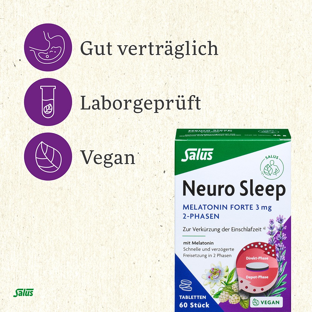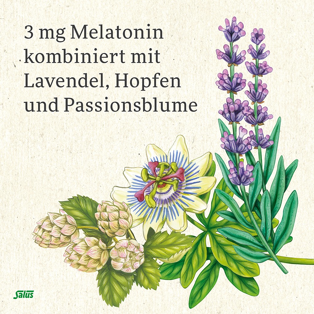 Ergänzt wird die besondere Melatonin-Kombination durch natürliche Extrakte wie Passionsblume, Hopfen und Lavendel. Die Tabletten entsprechen der laborgeprüften Qualität von Salus und sind vegan, vegetarisch, laktosefrei und glutenfrei.