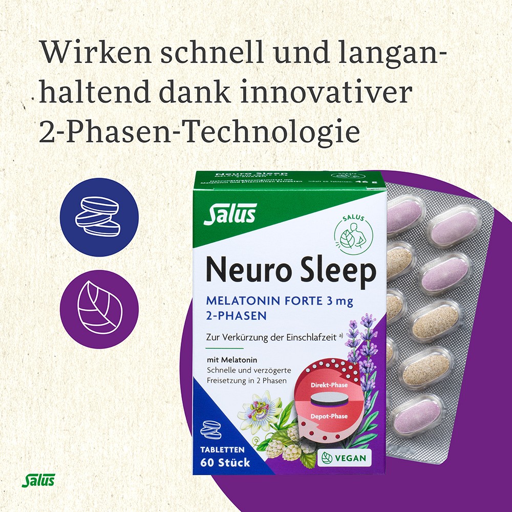 Neuro Sleep Melatonin Forte 3 mg 2-Phasen Tabletten wirken dank einer speziellen 2-Phasen Technologie sowohl schnell als auch langanhaltend: Denn in der ersten Phase wird dem Körper Melatonin zur Verkürzung der Einschlafzeit zur Verfügung gestellt. Die zweite Phase ermöglicht eine allmähliche Freisetzung über einen Zeitraum von mehreren Stunden.