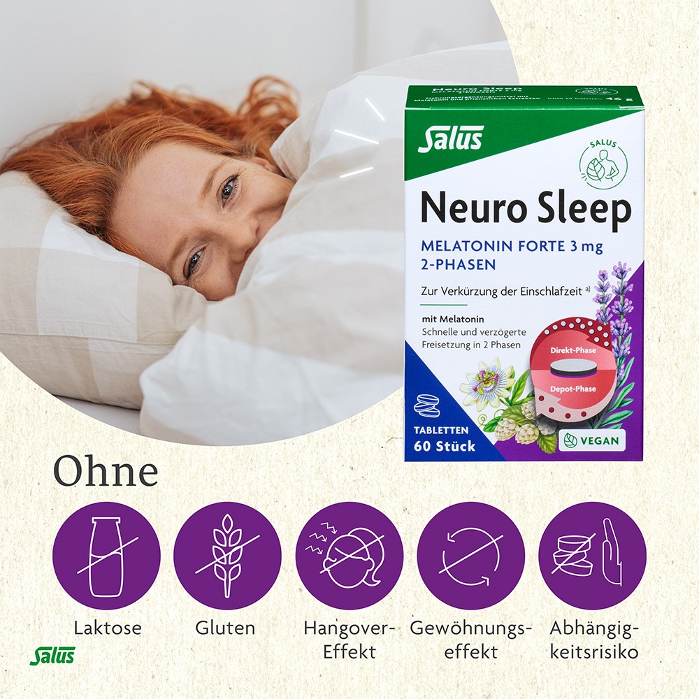 Die Melatoninfreisetzung der Neuro Sleep Melatonin Forte 3 mg 2-Phasen Tabletten orientiert sich an der natürlichen Melatoninproduktion des Körpers im Laufe der Nacht, die einen erholsamen, gesunden Schlaf fördert. Ein Gewöhnungseffekt und Abhängigkeitsrisiko bleiben aus. Tagesmüdigkeit – der sogenannte „Hangover-Effekt“ am nächsten Morgen – ist nach ausreichender Schlafdauer in der Regel nicht zu erwarten.