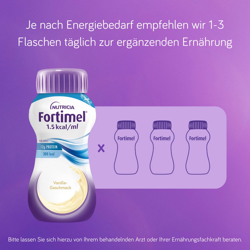 - Die Fortimel® 1.5 kcal Trinkmahlzeit mit Vanillegeschmack bietet eine optimale Möglichkeit, alle wichtigen Nährstoffe zu erhalten