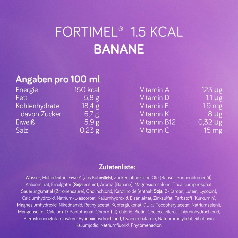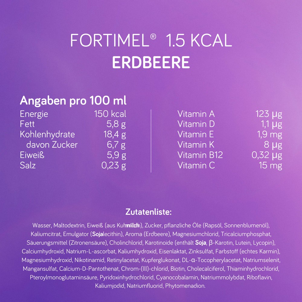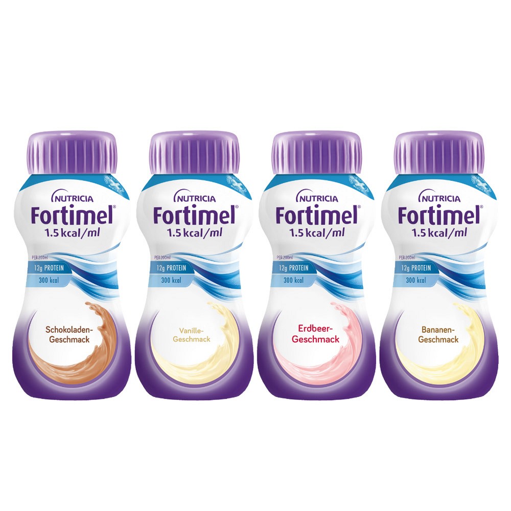 - Die Fortimel® 1.5 kcal Trinkmahlzeit in den Geschmacksrichtungen Erdbeere, Schokolade, Vanille und Banane bietet eine optimale Möglichkeit, alle wichtigen Nährstoffe zu erhalten