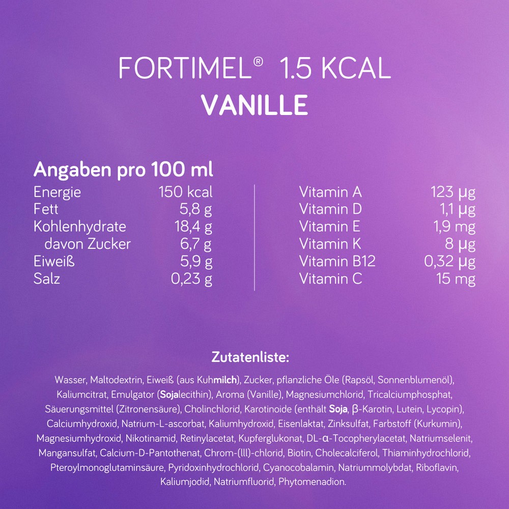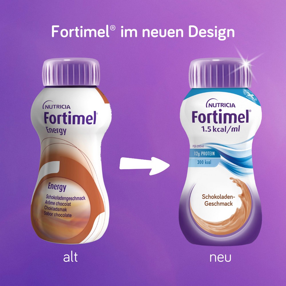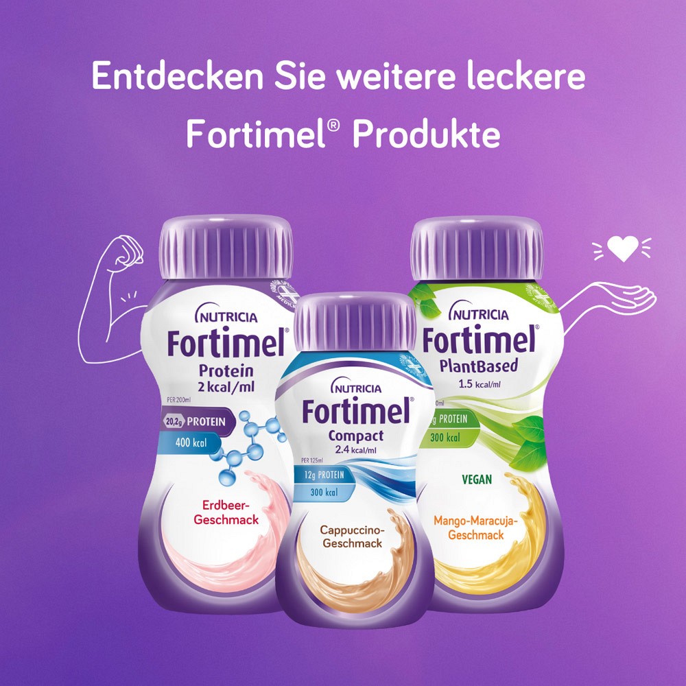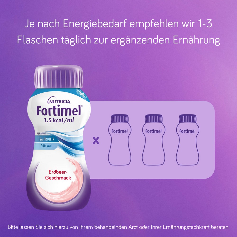 - Die Fortimel® 1.5 kcal Trinkmahlzeit in den Geschmacksrichtungen Erdbeere, Schokolade, Vanille und Banane bietet eine optimale Möglichkeit, alle wichtigen Nährstoffe zu erhalten