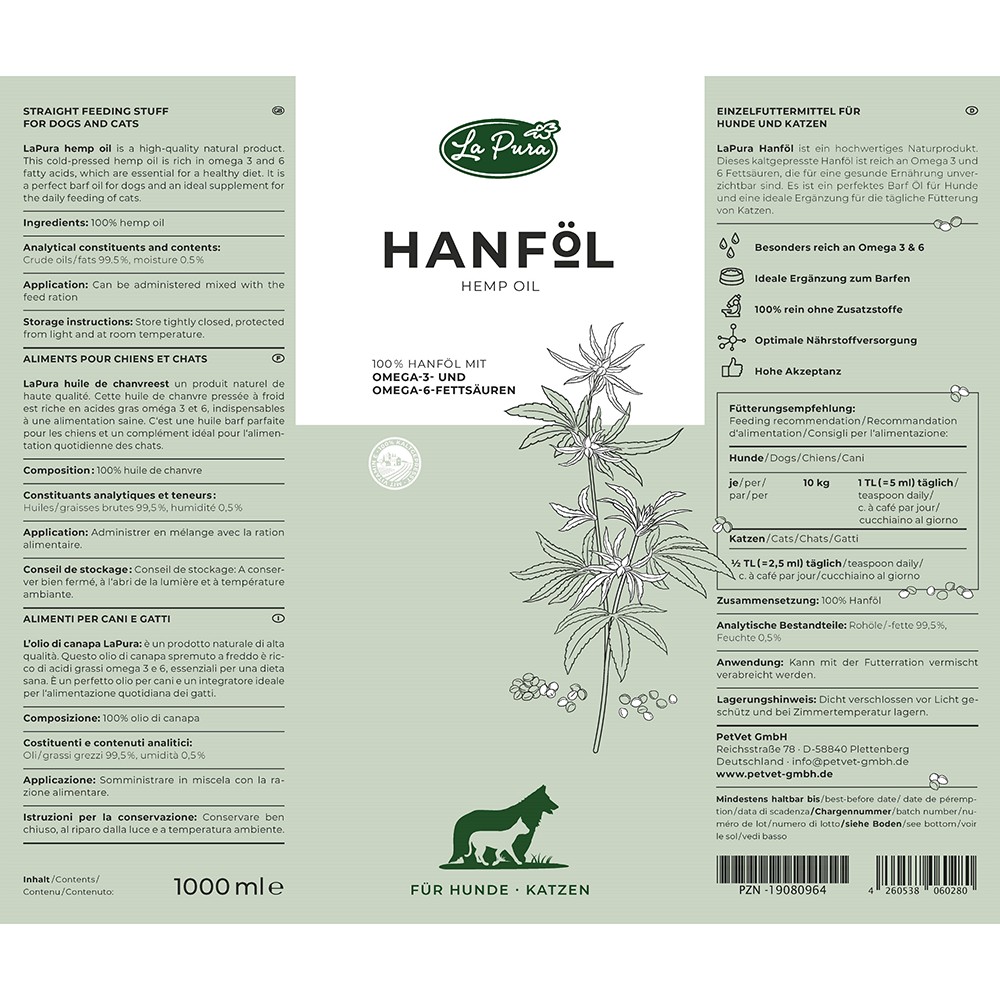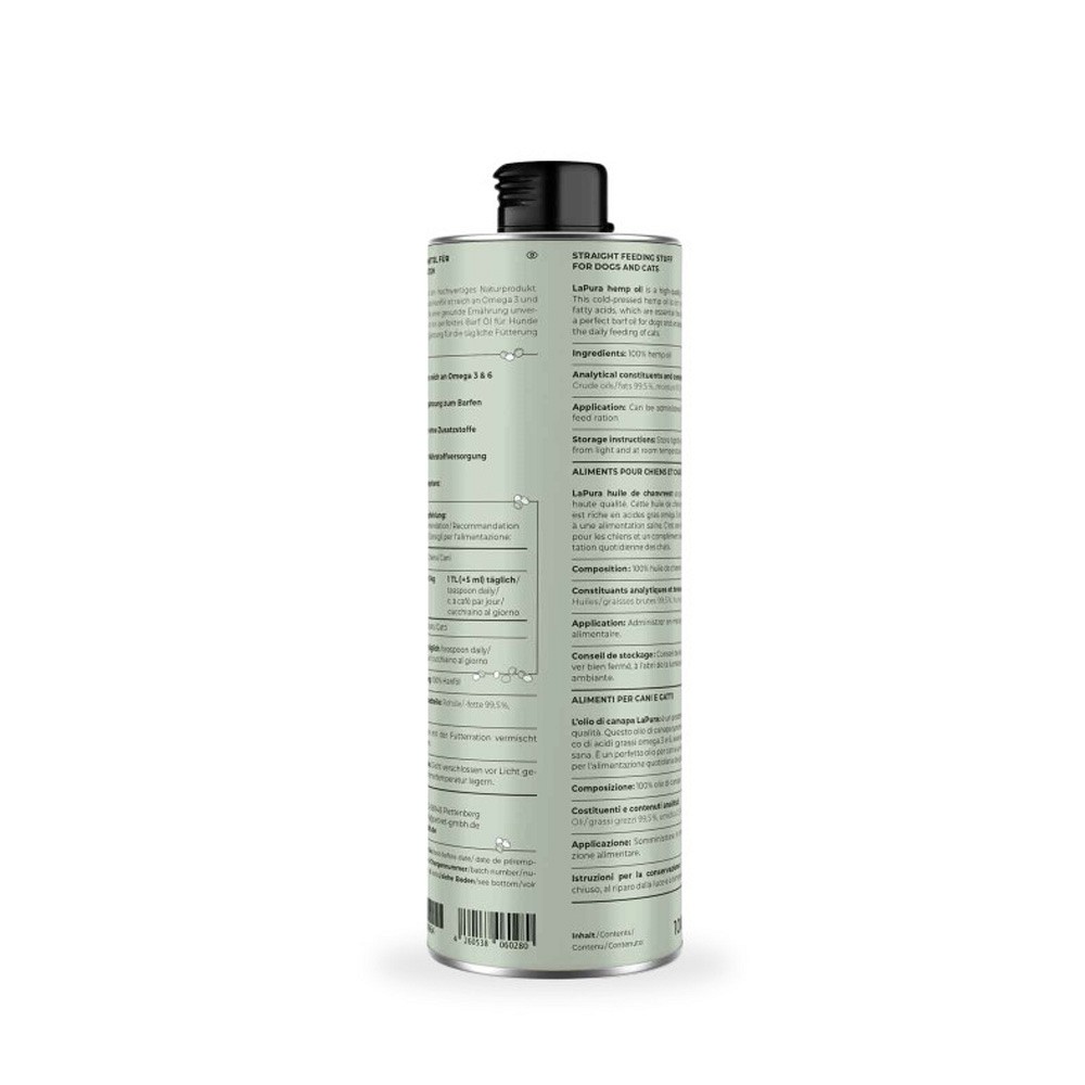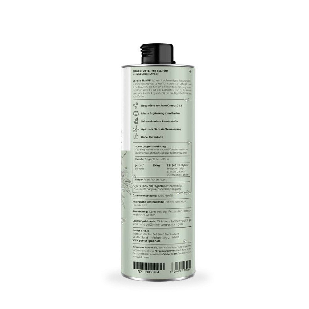 LaPura Hanföl ist ein hochwertiges Naturprodukt.Dieses kaltgepresste Hanföl ist reich an Omega 3 und 6 Fettsäuren, die für eine gesunde Ernährung unverzichtbar sind. Es ist ein perfektes Barf Öl für Hunde und eine ideale Ergänzung für die tägliche Fütterung von Katzen.