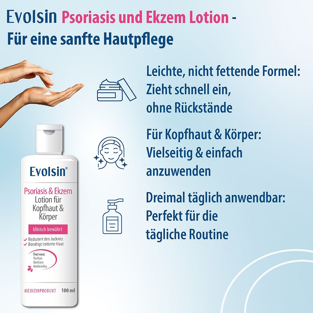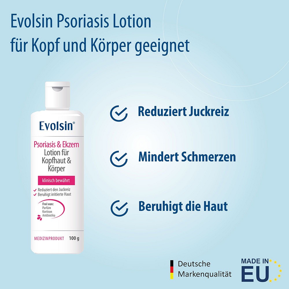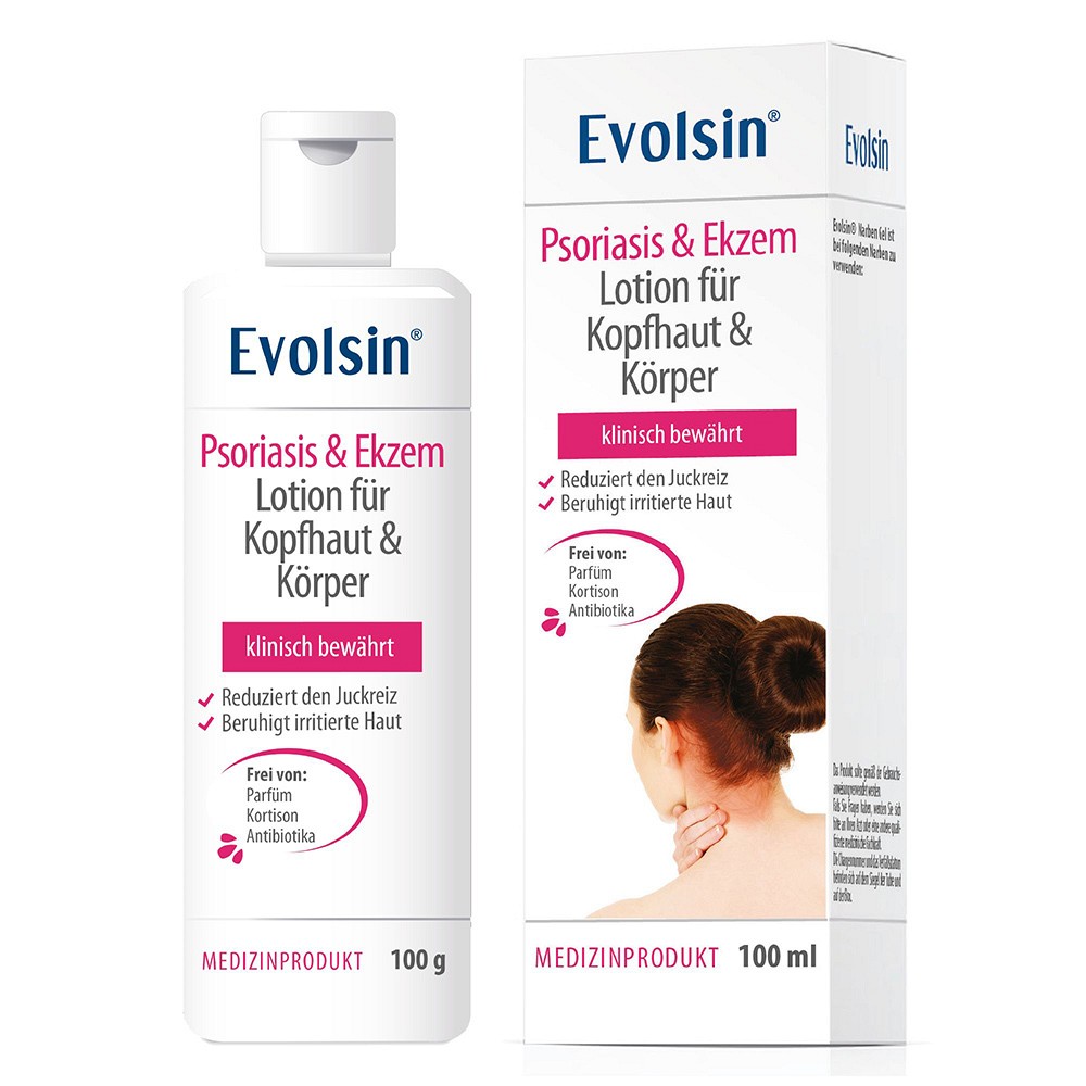 EVOLSIN PSORIASIS & EKZEM LOTION FÜR KOPFHAUT UND KÖRPER ist zur Behandlung von juckender, roter und schuppiger Haut oder Kopfhaut, die durch Psoriasis oder Dermatitis (Ekzeme) verursacht wird, bestimmt. EVOLSIN PSORIASIS & EKZEM LOTION FÜR KOPFHAUT UND KÖRPER lindert den Juckreiz und beruhigt die gereizte Haut.