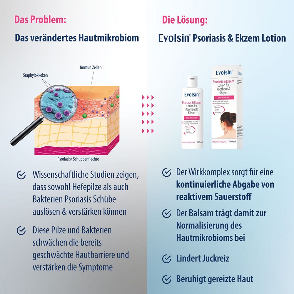 Die Wirkung der EVOLSIN PSORIASIS & EKZEM LOTION FÜR KOPFHAUT UND KÖRPER beruht auf der allmählichen Abgabe von Sauerstoff; die Lotion enthält keine Kortikosteroide oder Antibiotika. Diese kontinuierliche Sauerstoffabgabe schafft ein optimales Umfeld für die Heilung der Haut. Die Wirksamkeit von EVOLSIN PSORIASIS & EKZEM LOTION FÜR KOPFHAUT UND KÖRPER wurde durch klinische Forschung bestätigt.DAUER DER ANWENDUNG: