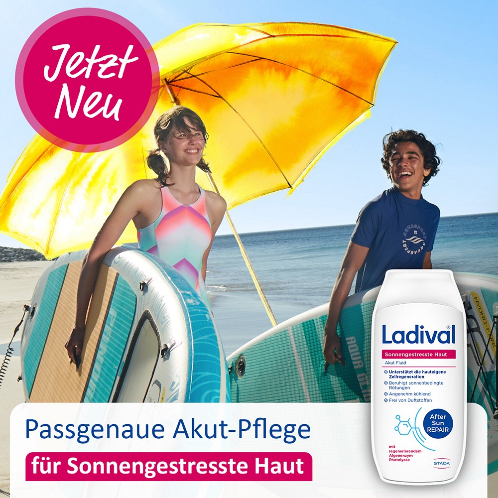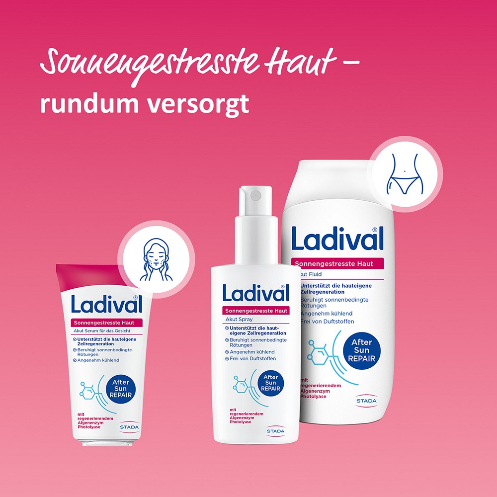 Sollte Ihre Haut von der Sonne gereizt sein und empfindlich reagieren, verschafft die Ladival Sonnengestresste Haut Akut-Serie schnell Linderung. Diese wurde speziell für UV-gereizte Haut entwickelt und unterstützt die hauteigene Zellregeneration mit dem Algen-Enzym Photolyase.
