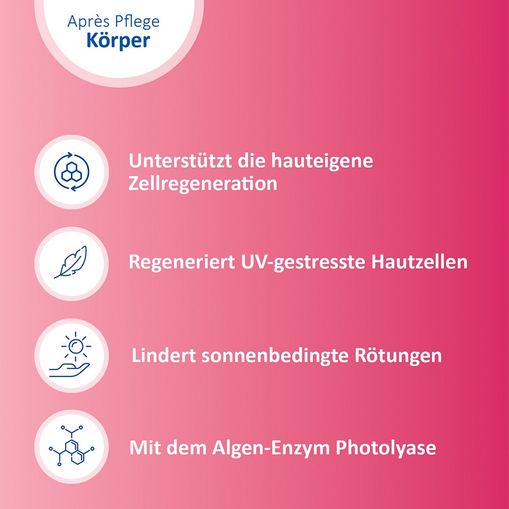 Nach Sonneneinstrahlung hilft die Photolyase, DNA-Schäden durch UV-Strahlung zu reparieren, indem es verklebte DNA-Basen auflöst, was zu einer Beruhigung von sonnenbedingten Rötungen und Spannungsgefühlen führt.