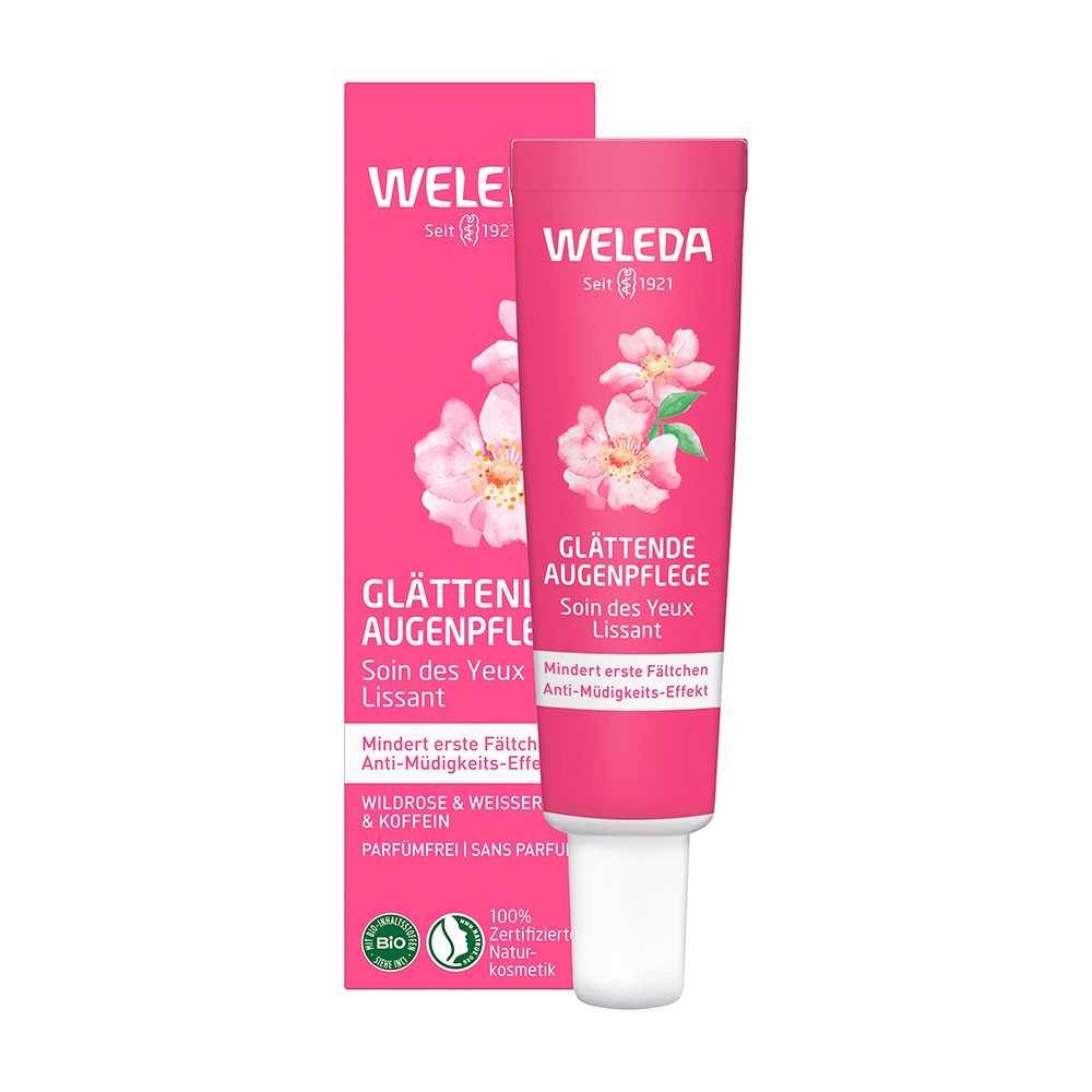 Die neue Weleda Glättende Augenpflege mit Bio-Wildrosenöl & Weißem Tee verringert Augenringe und Schwellungen und mindert erste Fältchen.