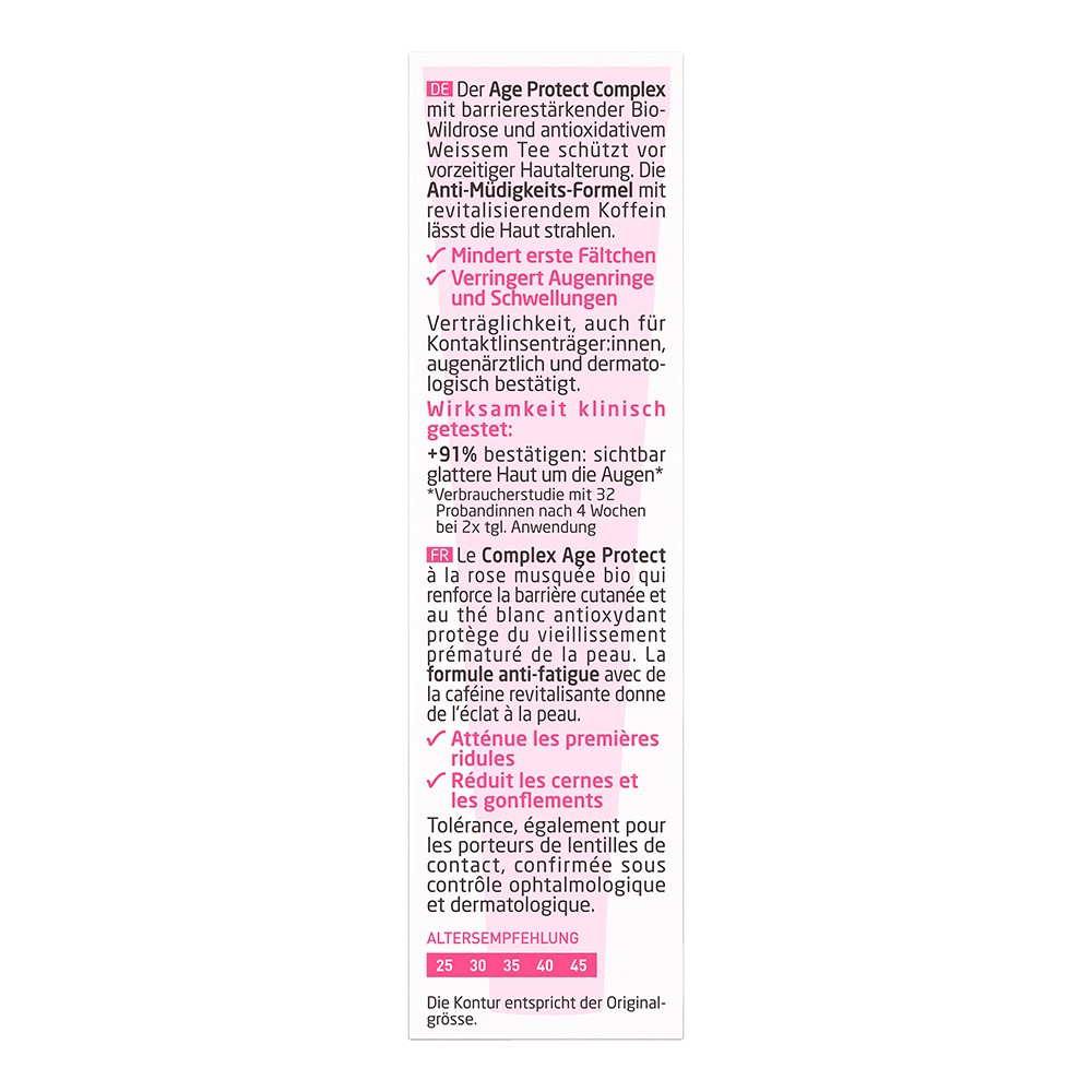 Die seidige Augenpflege stärkt die Barriere der zarten Haut um deine Augen und glättet die Haut sichtbar. Die Anti-Müdigkeits-Formel mit revitalisierendem Koffein lässt die Haut strahlen. Bio-Wildrosenöl und der Extrakt aus antioxidativem Weißem Tee bilden den Age- Protect- Complex, der wirksam vor ersten Anzeigen der Hautalterung schützt.