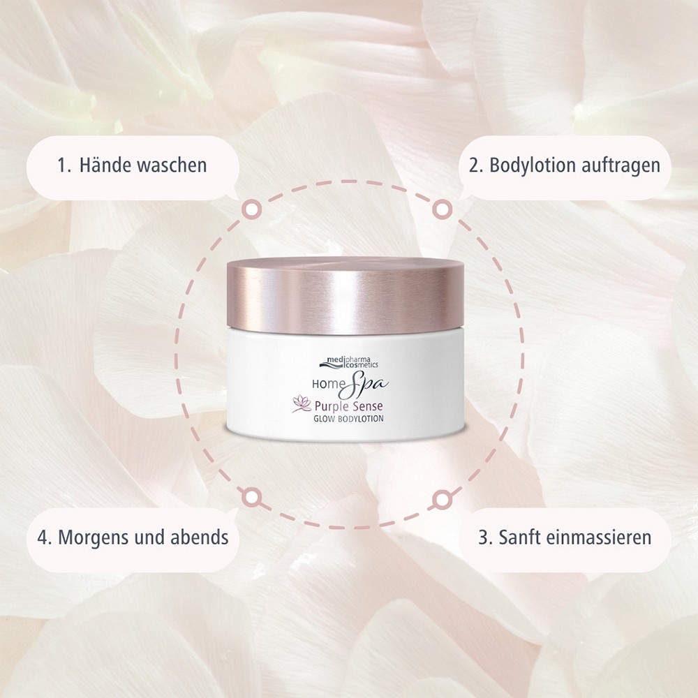 Die medipharma cosmetics Home Spa Purple Sense Glow Bodylotion pflegt die Haut mit Glycerin, feuchtigkeitsspendender Hyaluronsäure und Bio-Hibiskus-Extrakt für ein sinnliches Spa-Erlebnis im eigenen Zuhause.