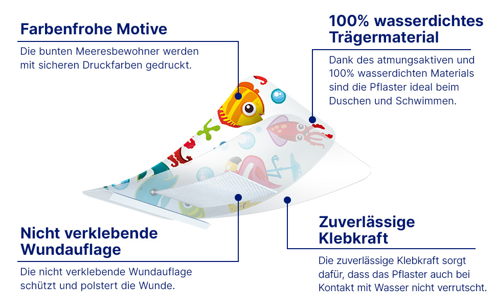 Die 100% wasserdichten Pflaster eignen sich für alle Arten von kleineren Wunden bzw. Verletzungen. Die Pflaster verrutschen nicht, während die nicht verklebende Wundauflage die Wunde schützt und polstert. Das Trägermaterial ist flexibel und atmungsaktiv, bietet so mehr Komfort und schützt die Wunde vor Kontakt mit Wasser.Die bunt bedruckten Pflaster haben einen zuverlässigen Kleber, der ein hohes Maß an Schutz bietet, wodurch sie ideal zum Waschen, Duschen, Baden und Schwimmen geeignet sind. Die farbenfrohen Motive werden dein Kind sofort ablenken und begeistern - dank Schildkröten, Fischen, Flamingos, Haien und vielen weiteren Meerestieren!