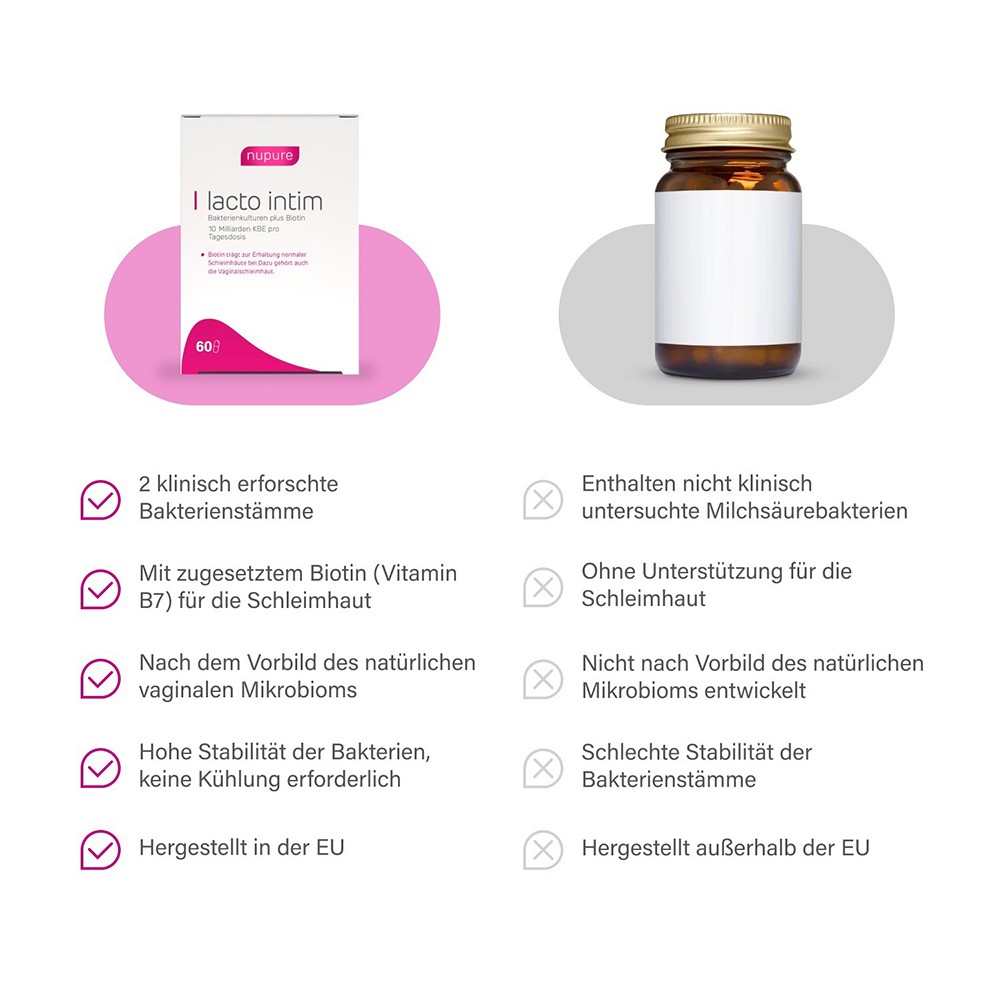 Nupure lacto intim enthält zusätzlich Biotin. Biotin trägt zur Erhaltung normaler Schleimhäute bei. Dazu gehört auch die Vaginalschleimhaut.Praktische Einnahme auch unterwegs