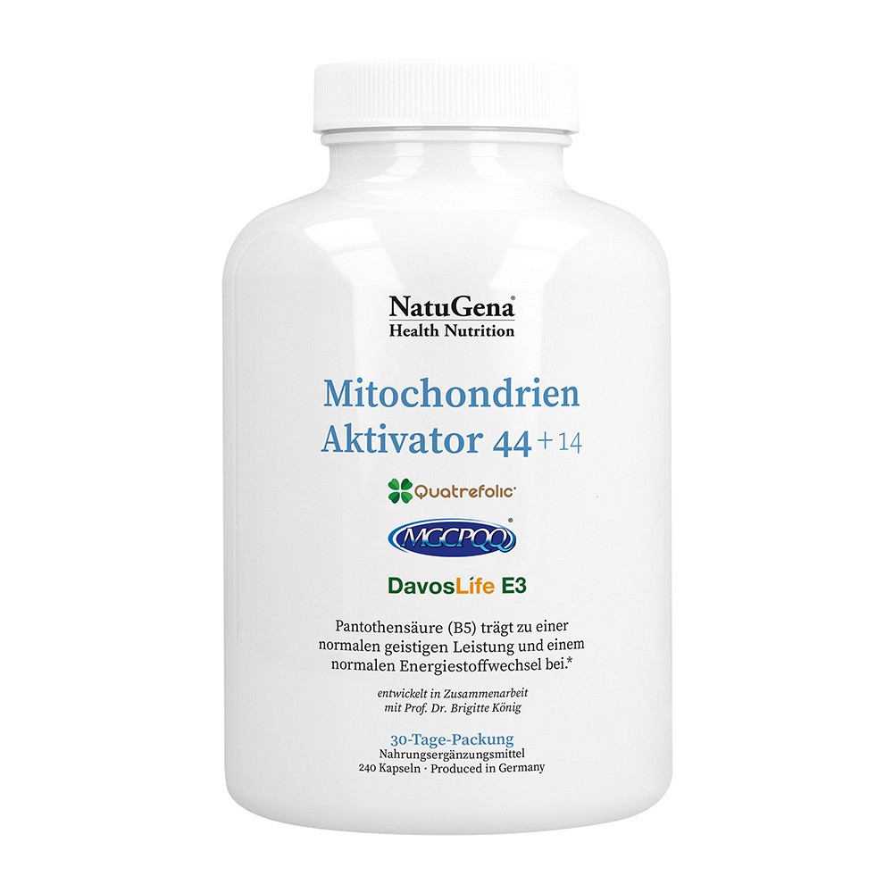 Mitochondrien Aktivator 44+14 von NatuGena kombiniert Vitamine, Mineralstoffe, Antioxidantien, Aminosäuren und weitere Nährstoffe.