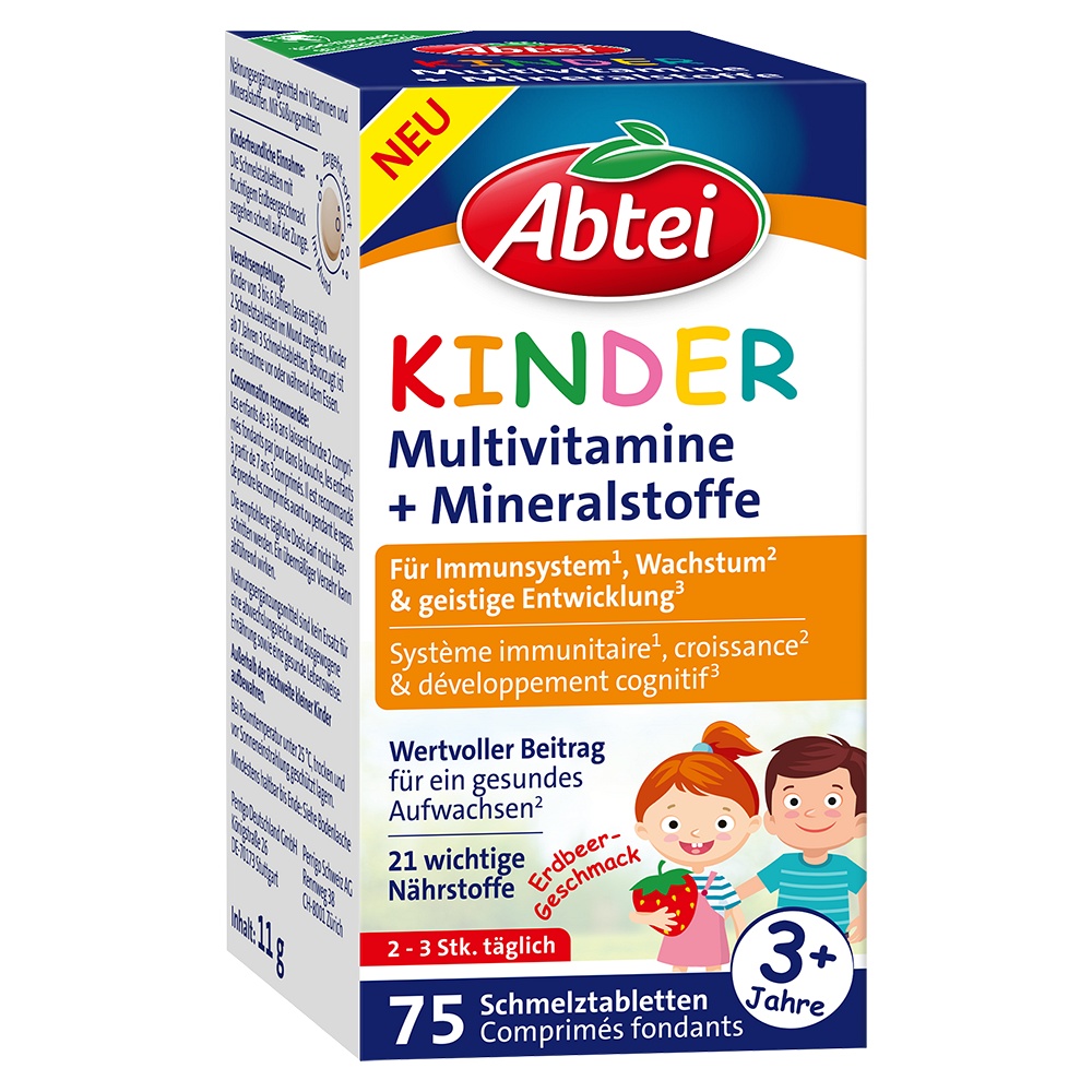 Kinder erleben ein beeindruckendes Wachstum – körperlich, geistig und emotional. In dieser entscheidenden Phase spielt eine ausgewogene Ernährung eine Schlüsselrolle. Abtei Kinder Multivitamine + Mineralstoffe Schmelztabletten mit hochwertigen und wissenschaftlich geprüften Inhaltsstoffen sind speziell für Kinder ab 3 Jahren konzipiert.
