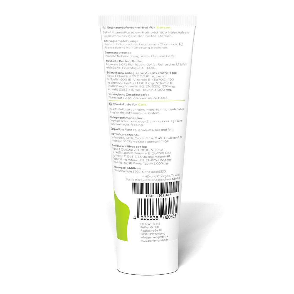 Die PHA VitaminPaste für Katzen hilft die Gesundheit und das Wohlbefinden der geliebtenVierbeiner zu unterstützen. Die Paste enthält eine ausgewogene Mischung aus Taurin undVitaminen, die wichtige Nährstoffe liefern, um die Vitalität und das Immunsystem Ihrer Katzezu stärken.