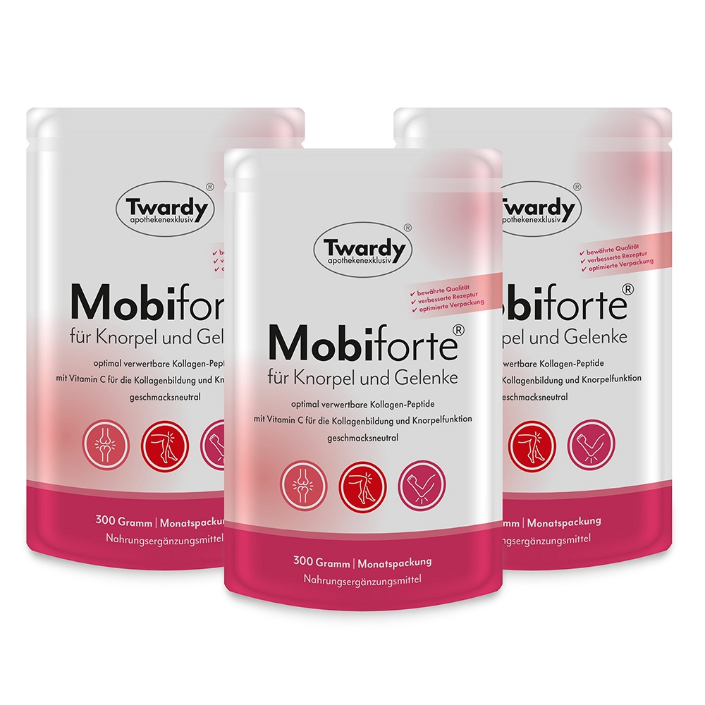 Mobiforte ist ein Nahrungsergänzungsmittel mit sehr gut bioverfügbarem Collagen-Hydrolysat (= Kollagen-Peptide) und Vitamin C.Kollagen ist das Hauptstrukturprotein unseres Bindegewebes, es kommt vor allem in der Haut, den Knorpeln, Sehnen und Knochen vor. Dort sorgt es in erster Linie für Struktur, Festigkeit und Zusammenhalt der Gewebsstrukturen.