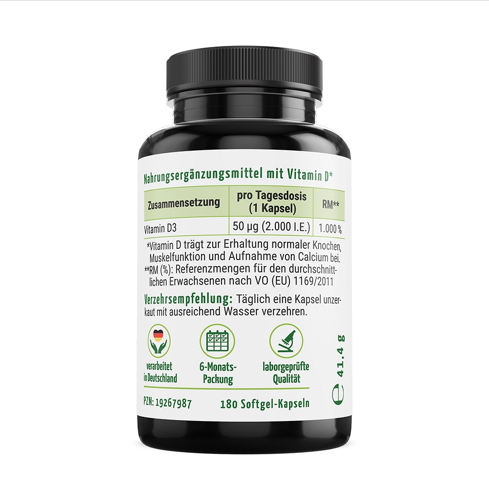 Mit meinen 180 Kapseln versorge ich dich sechs Monate lang jeden Tag mit 2.000 Internationalen Einheiten Vitamin D3. So kannst du dich darauf verlassen, dass ich dir für die sonnenarmen Monate ein zuverlässiger Begleiter bin.