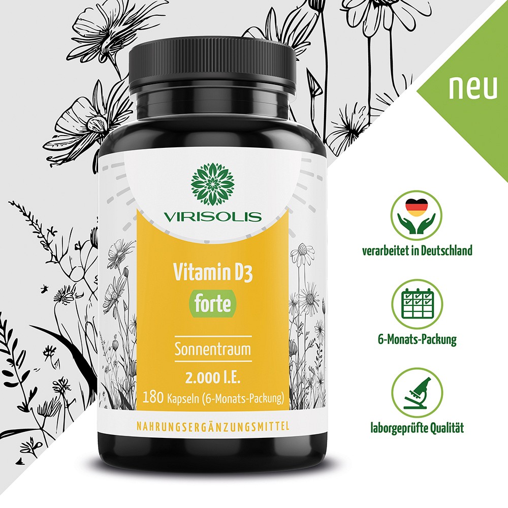 Hallo, ich bin ViriSolis Sonnentraum, dein Sonnenschein im Taschenformat. Als Nahrungsergänzungsmittel bin ich darauf spezialisiert, dich mit dem wertvollen Vitamin D3 zu versorgen – auch an trüben Tagen, an denen die Sonne nicht scheint.Vitamin D3, auch bekannt als das Sonnenvitamin, trägt zu einer normalen Funktion deines Immunsystems bei und unterstützt die Erhaltung normaler Knochen und Zähne. Es hilft außerdem dabei, eine normale Muskelfunktion aufrechtzuerhalten. Damit das fettlösliche Vitamin D3 optimal von deinem Körper aufgenommen werden kann, enthält jede meiner Kapseln hochwertiges Färberdistelöl.