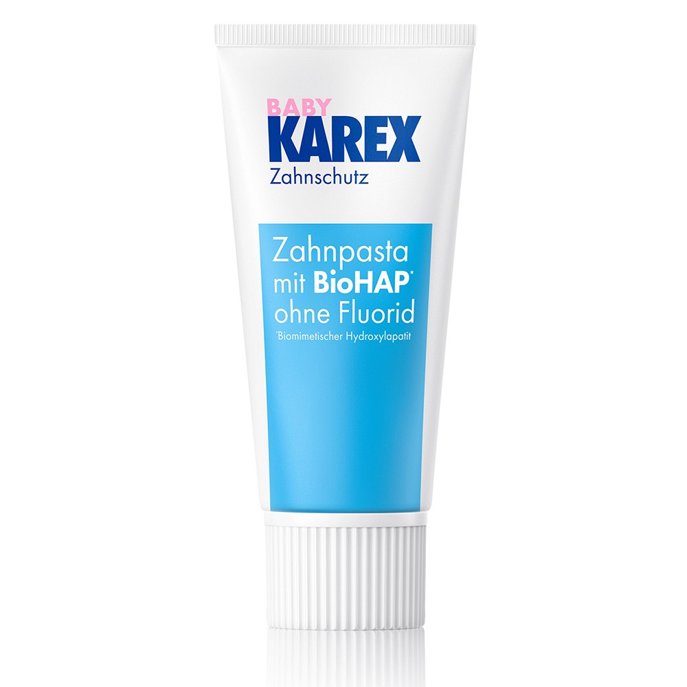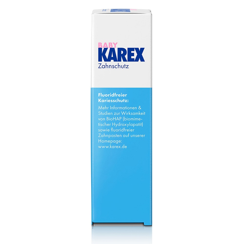 Dank der innovativen Wirkformel mit dem Wirkstoffkomplex „BioHAP“ schützt BABY KAREX genauso effektiv vor Karies wie herkömmliche fluoridhaltige Zahnpasten und ist bei Verschlucken unbedenklich.